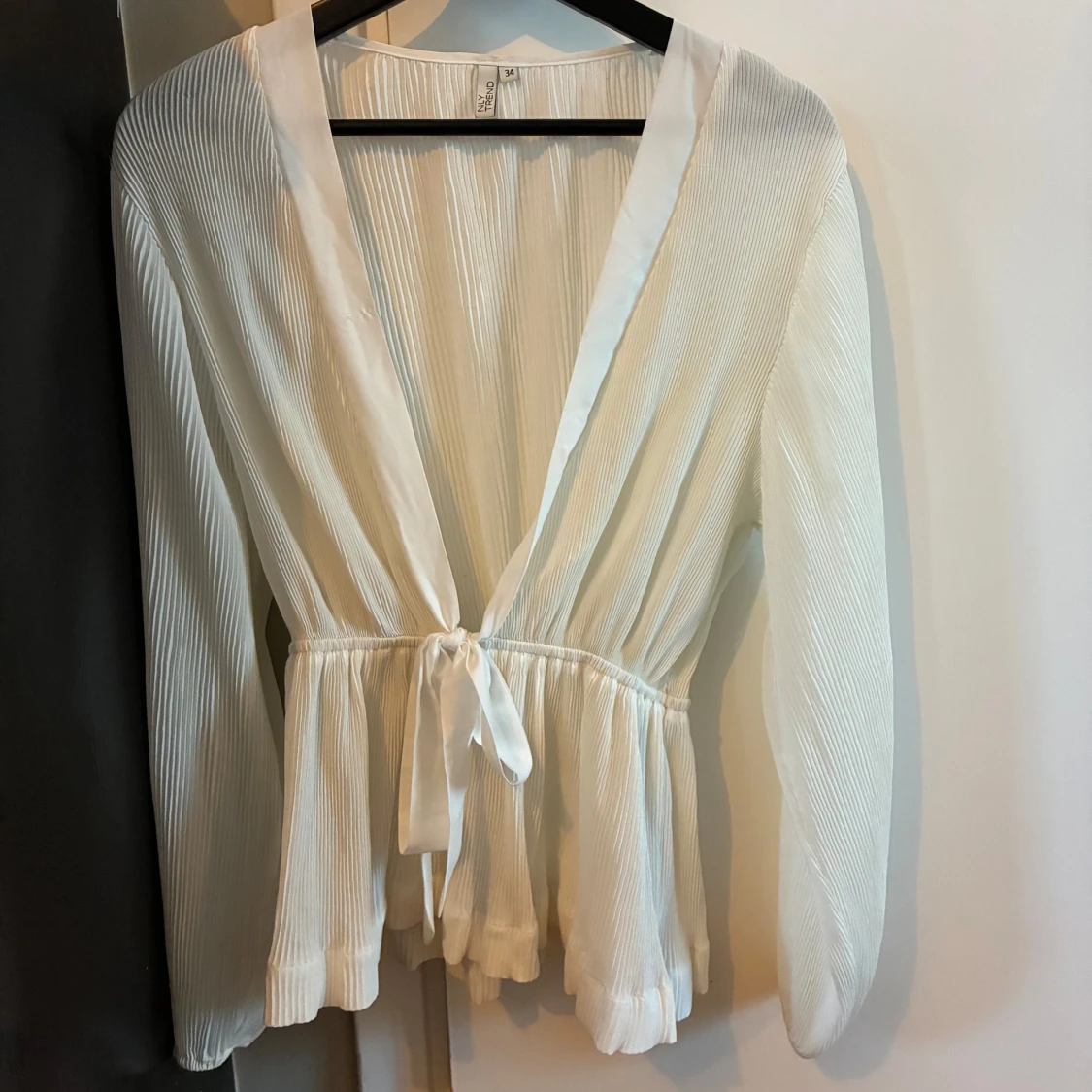 Superfin vit omlottblus från NAKD med plisserat tyg och långa ärmar. Blusen har ett brett satinband att knyta i midjan och v-ringad halsringning. Perfekt för dig som gillar romantiska och luftiga plagg.
