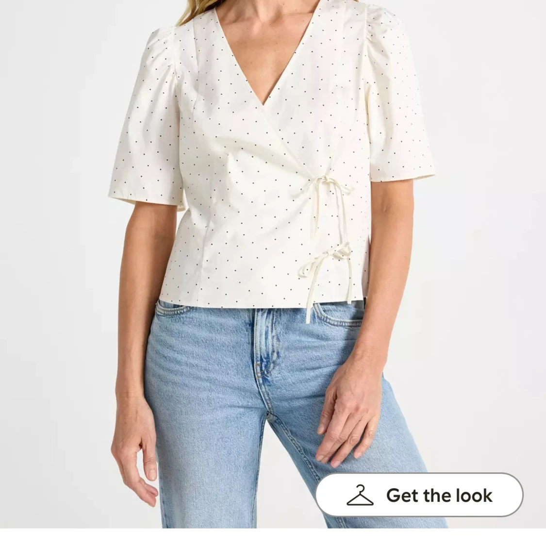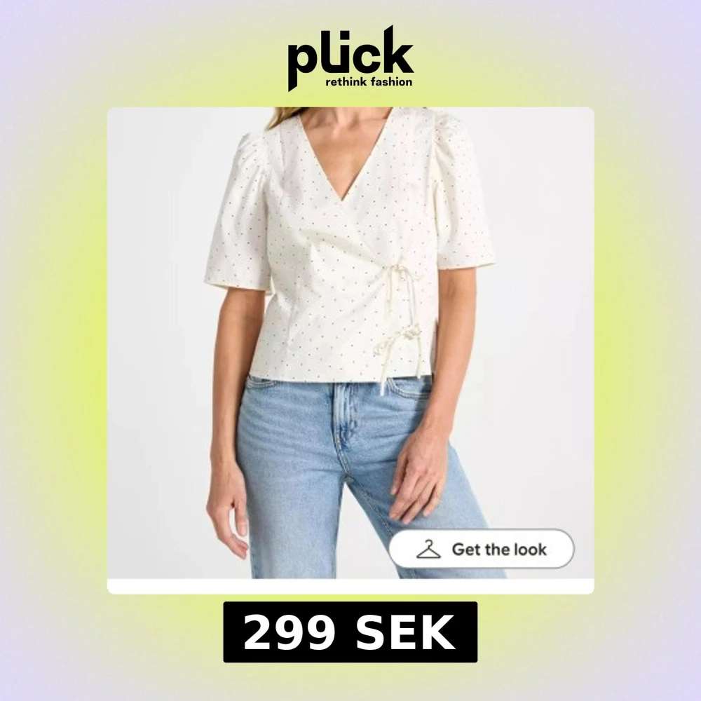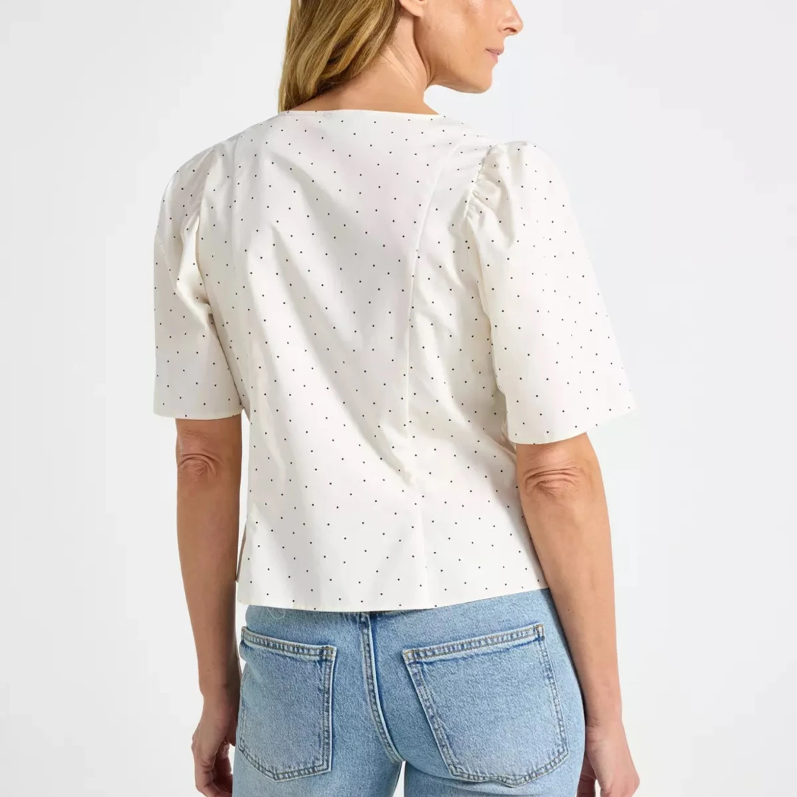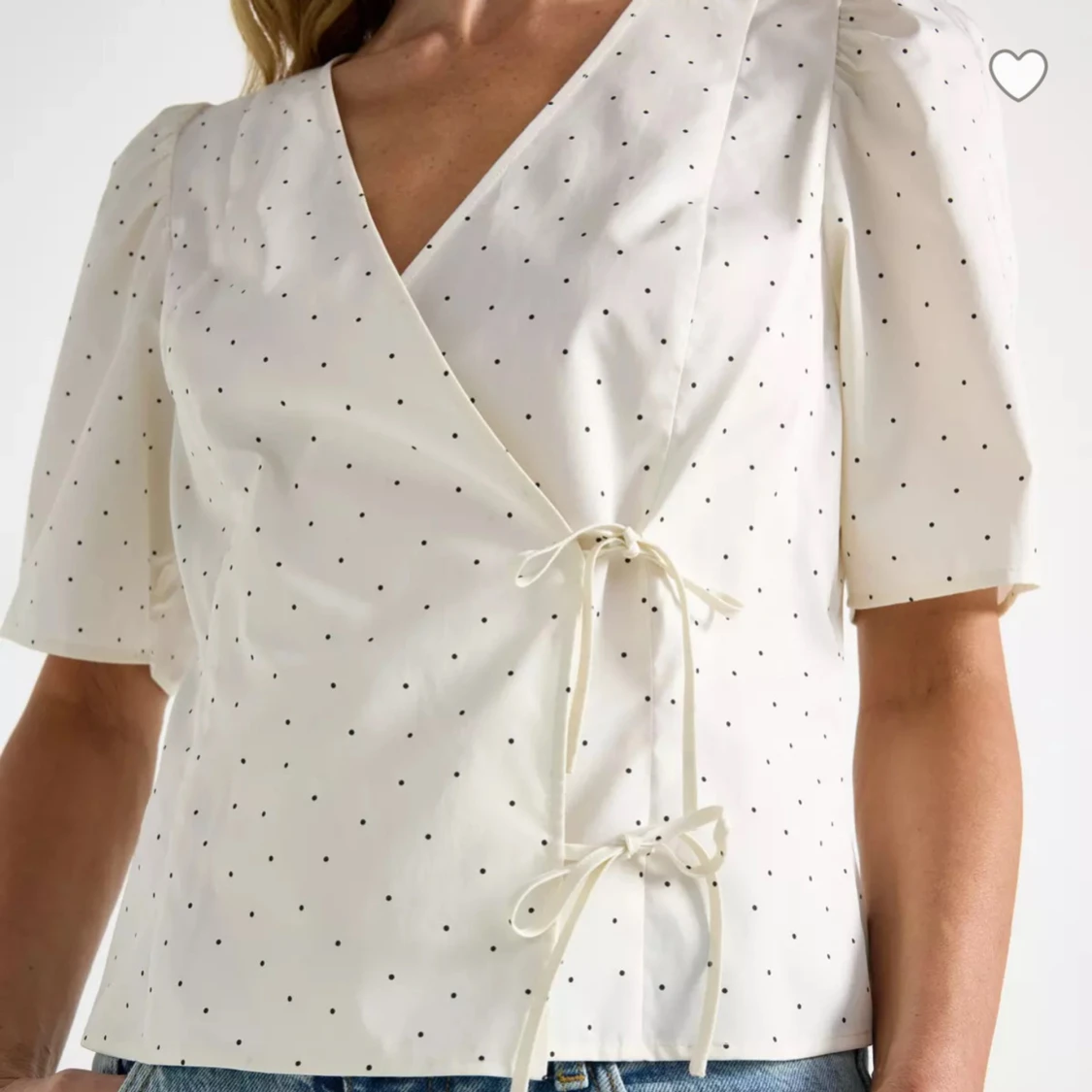 Snygg vit omlottblus med svarta prickar och korta puffärmar. Blusen har v-ringning och knytband i sidan. Aldrig använd då jag ångrar köpet, dock e prislappen av.