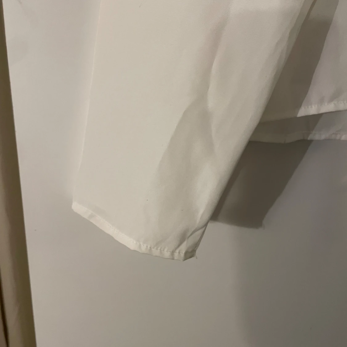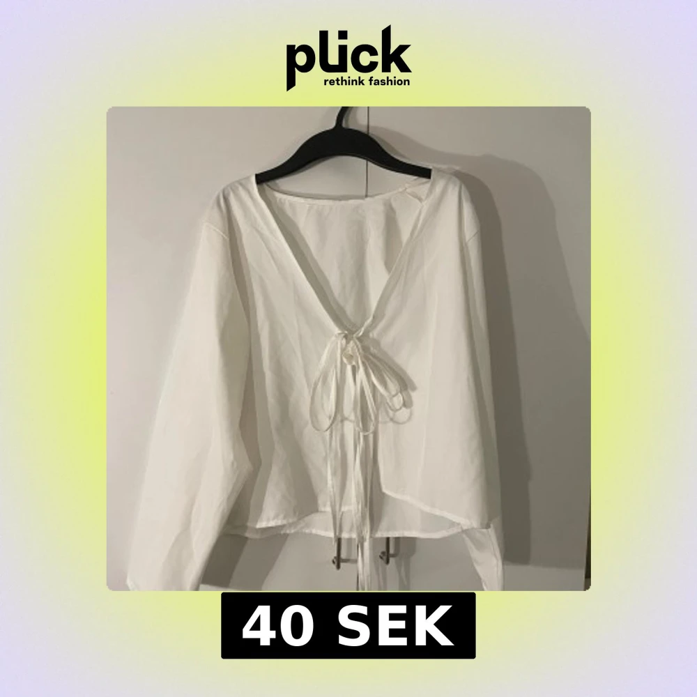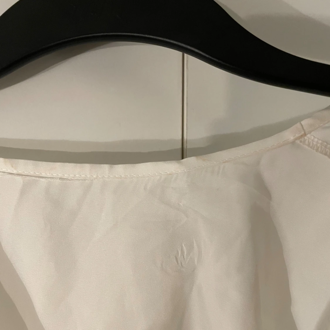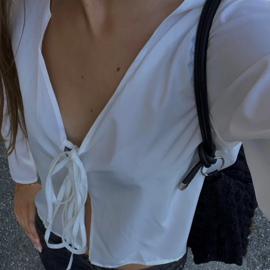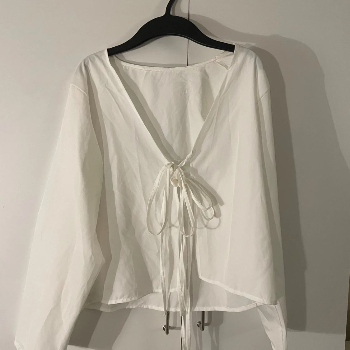 Säljer en vit blus med omlott-design och djup v-ringning. Blusen har långa ärmar och knyts framtill med snörning, ser inte lika mycket ut med knytningen när man har den på! Liten sminkfläck