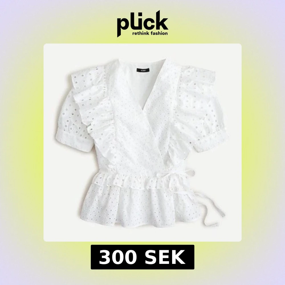 Superfin vit omlottblus med korta puffärmar, volang längs framkanten och broderade hål. Knytning i midjan och v-ringad hals. Perfekt för en fräsch och somrig look!