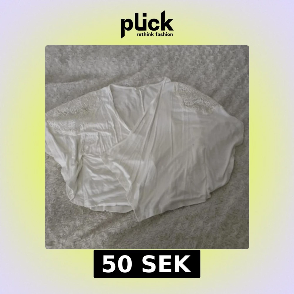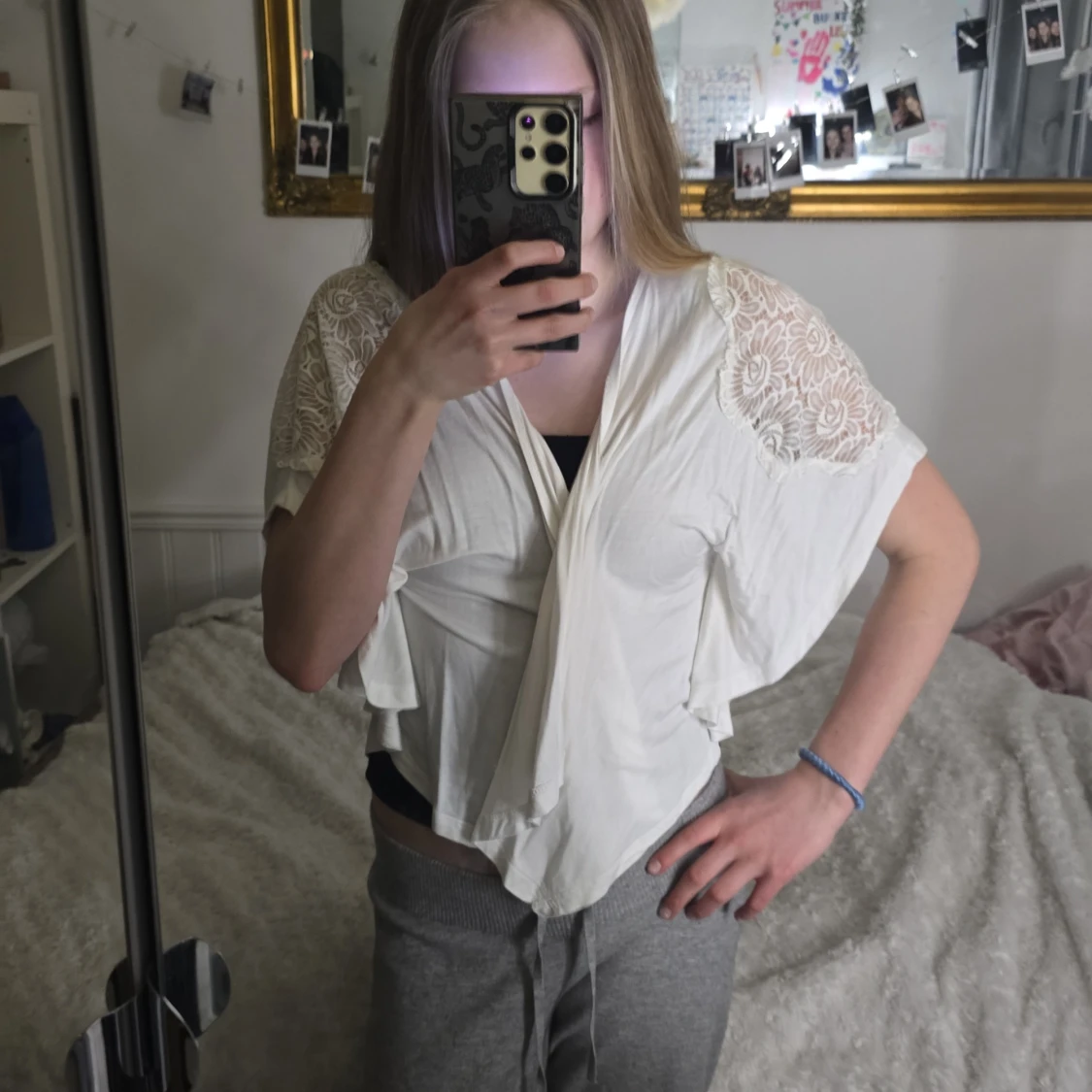 Säljer en vit omlottopp från KappAhl med vackra spetsdetaljer på axlarna. Toppen har en lös passform och korta ärmar, perfekt för en stilren look. Passar bra till både jeans och kjol. 🌟