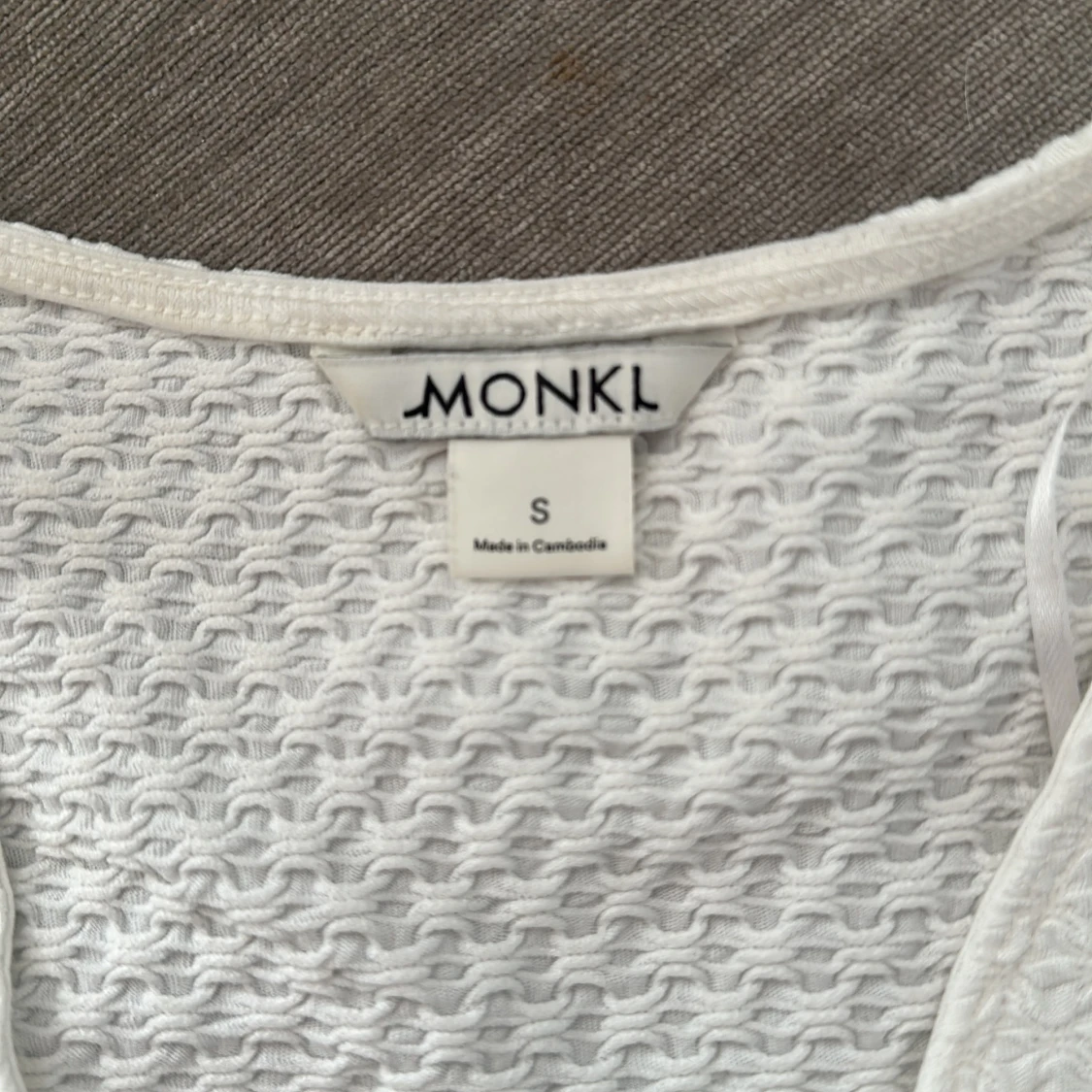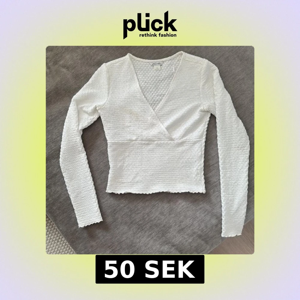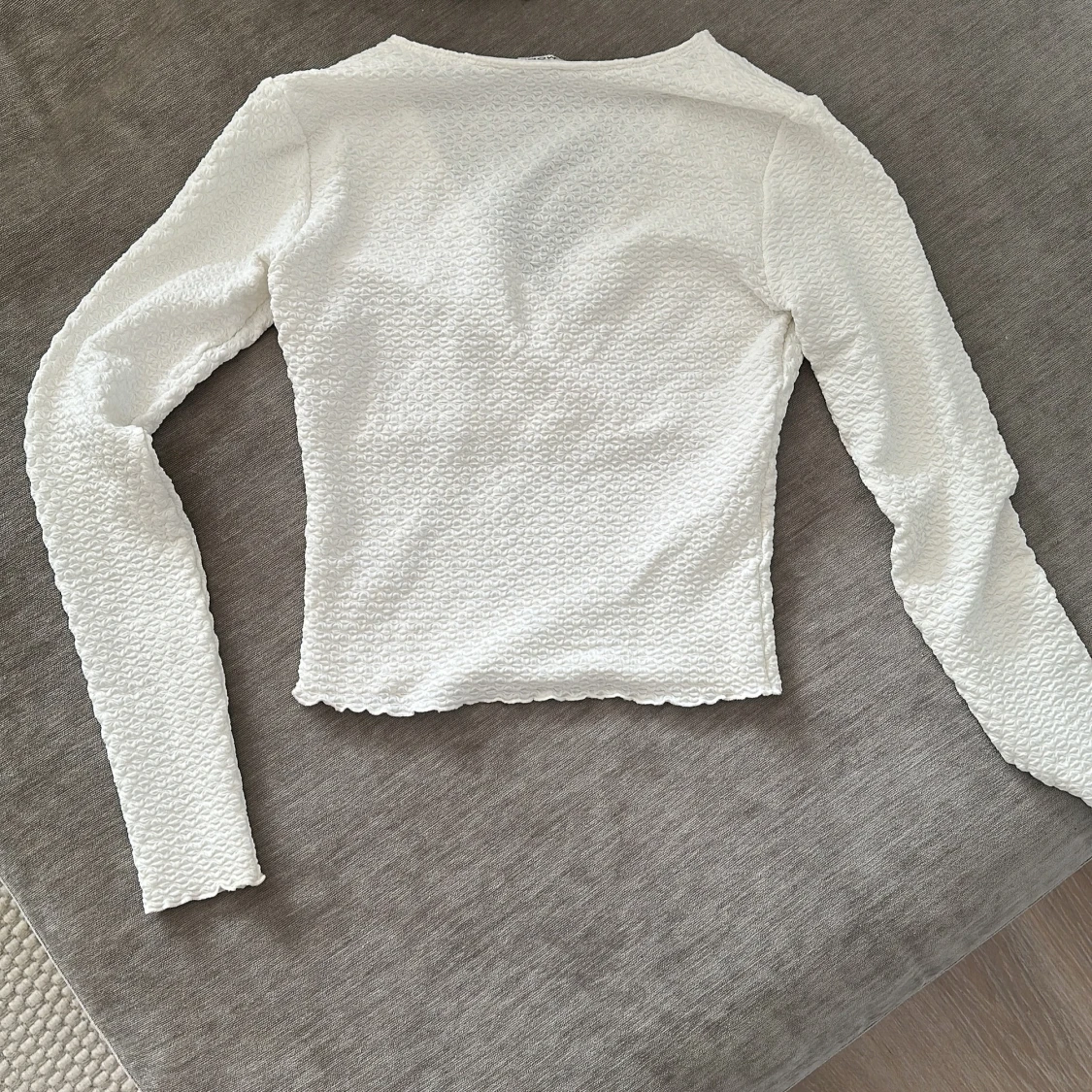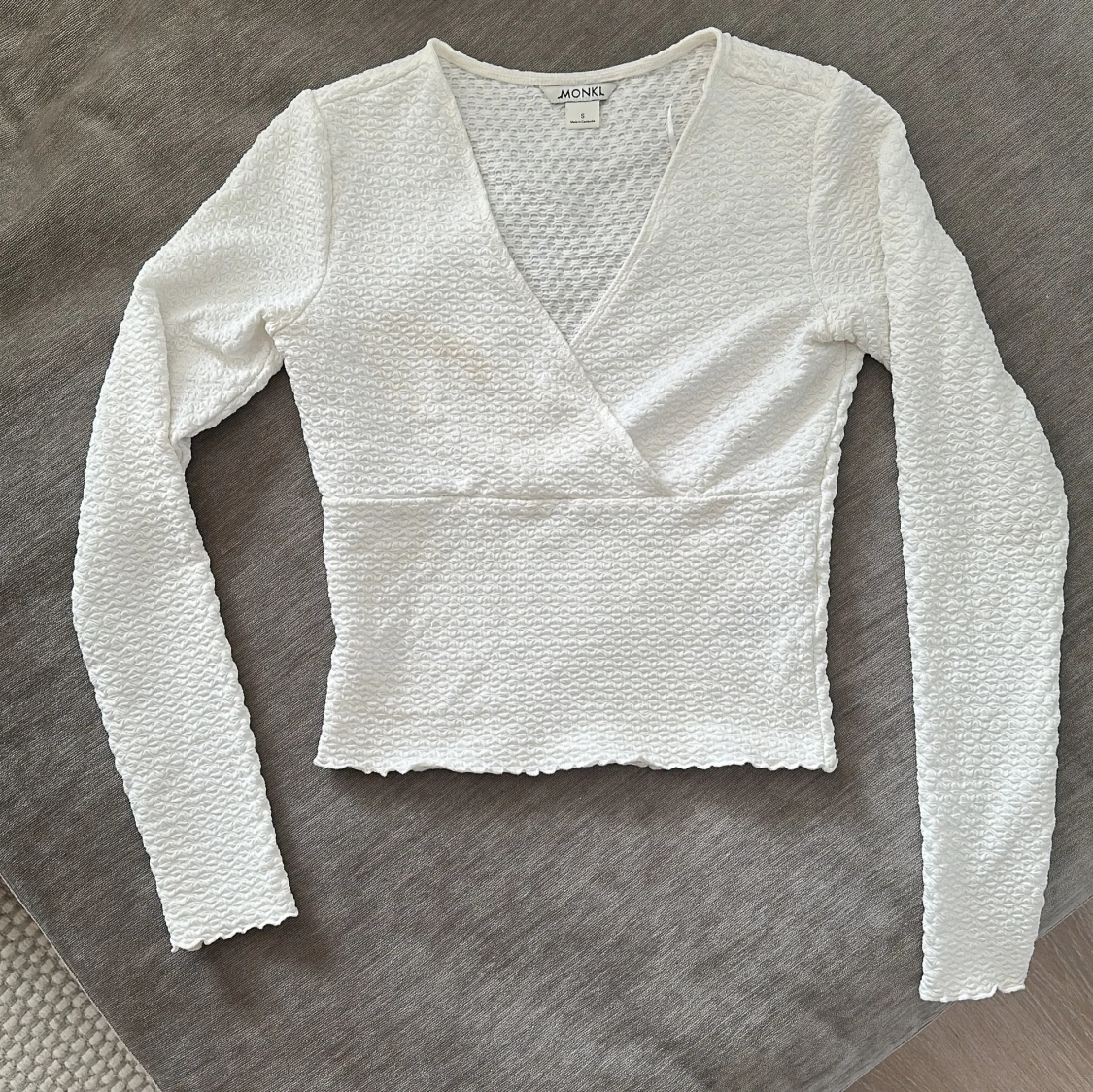 Supersnygg vit omlottopp från Monki i strukturerad bomullsmix. Toppen har lång ärm, v-ringning och croppad passform.