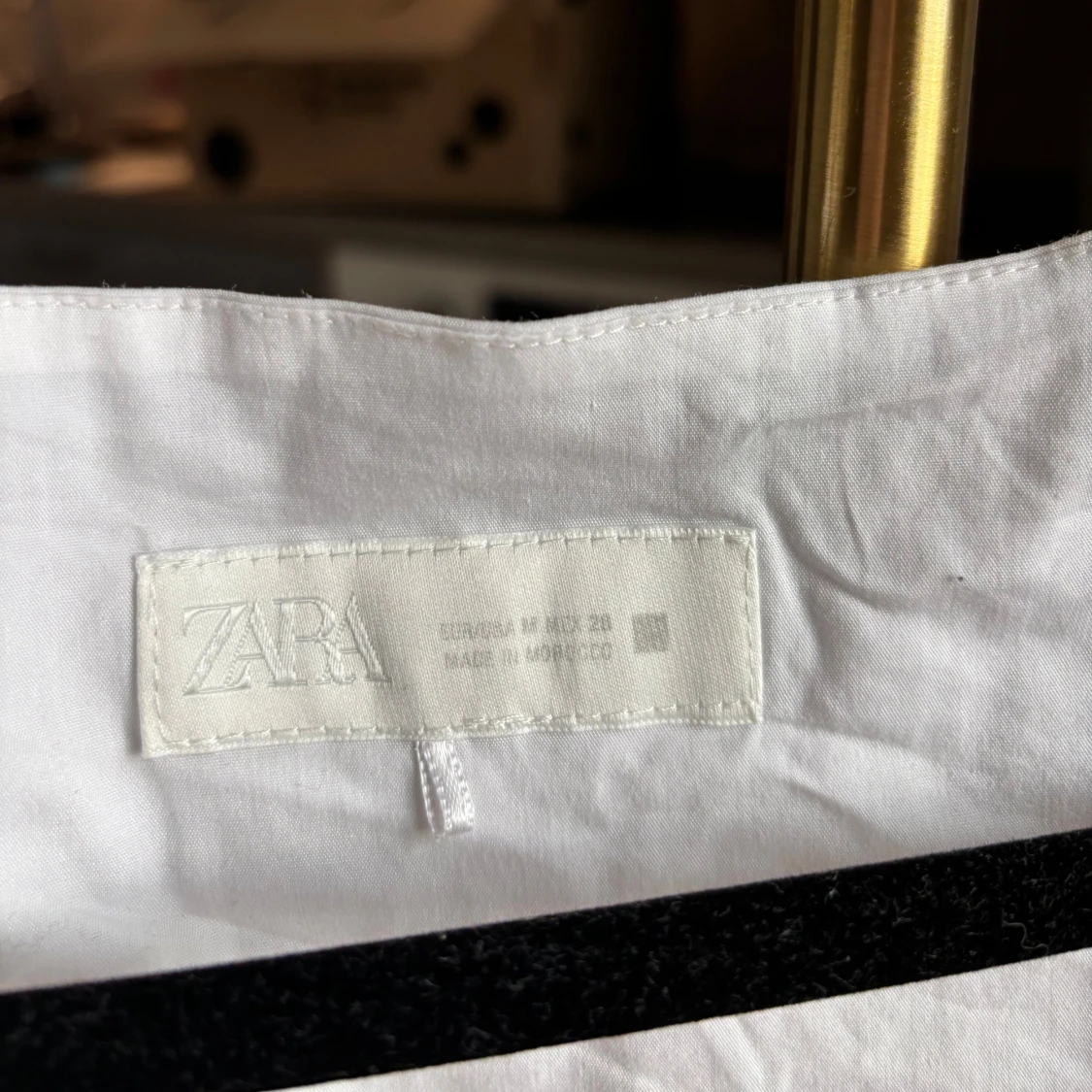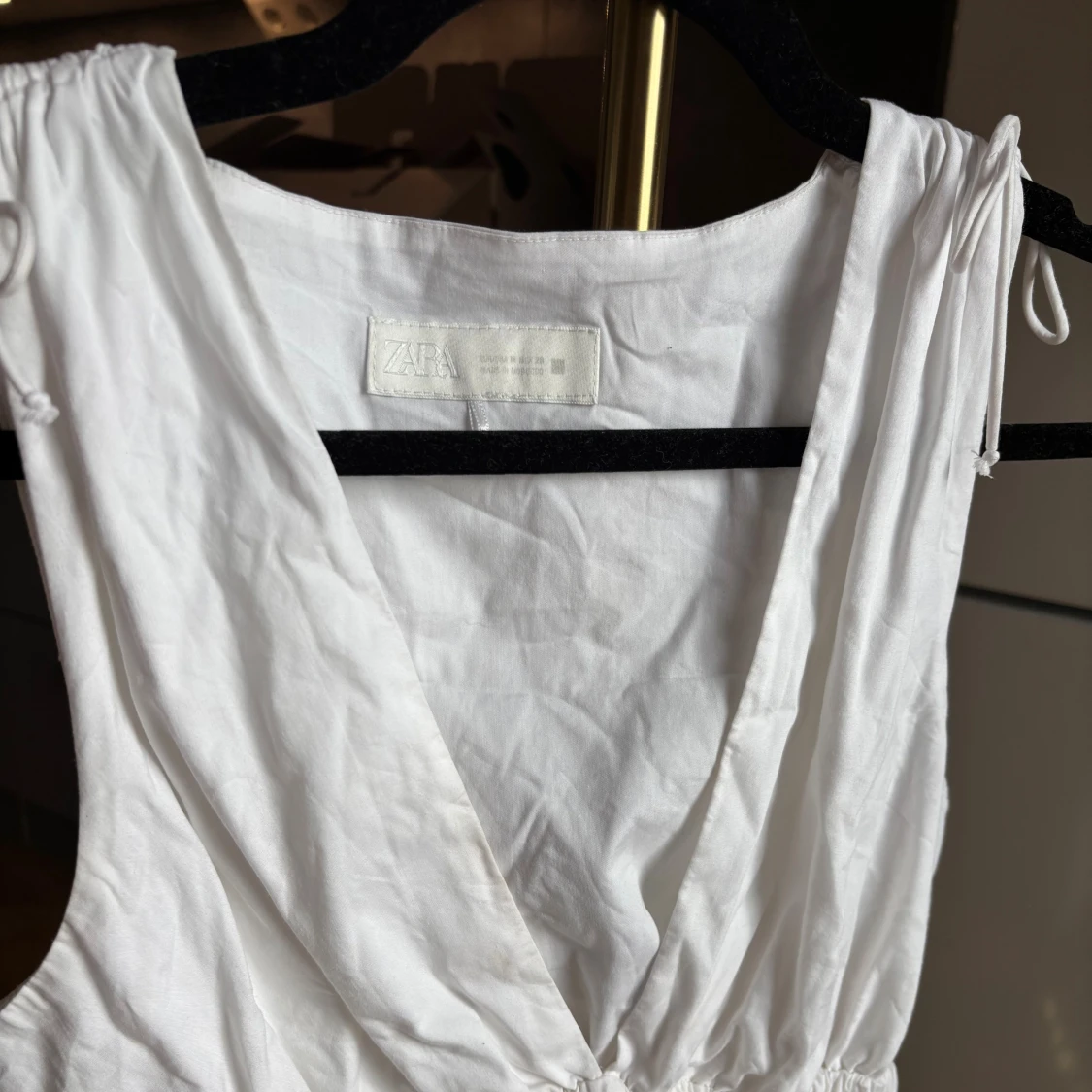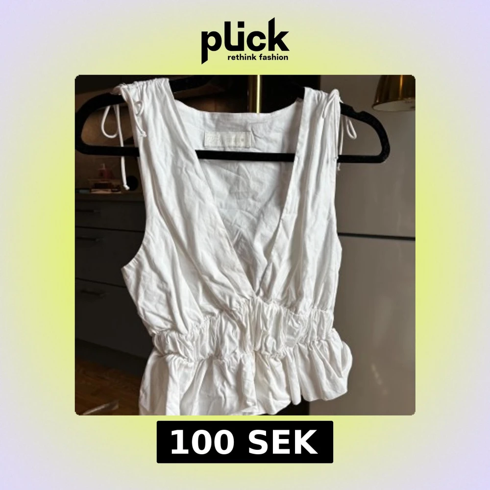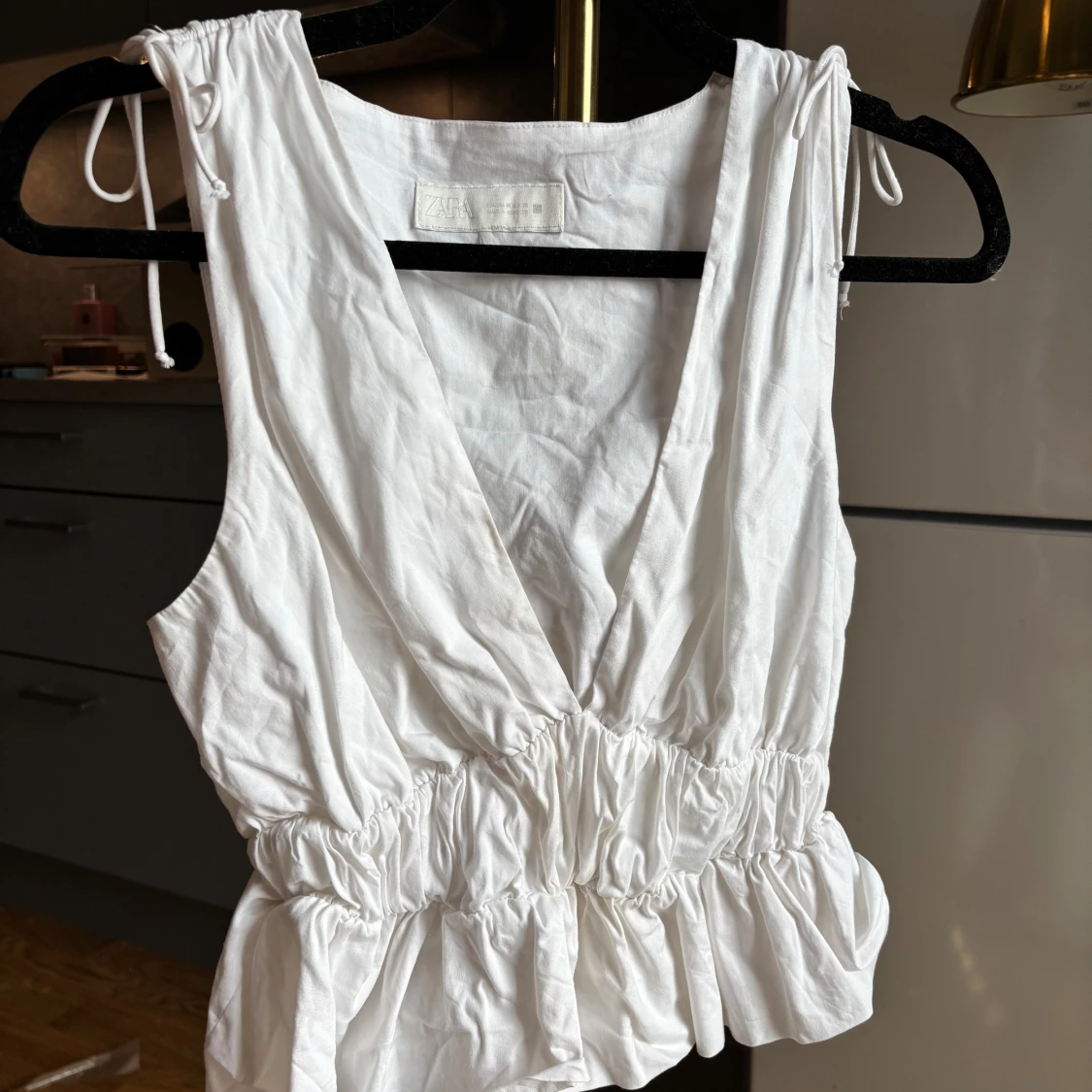 Säljer en vit omlottopp från Zara med djup v-ringning och knytband på axlarna. Toppen har resår i midjan som ger en snygg volangkant nedtill. Perfekt för dig som gillar en luftig och trendig look.