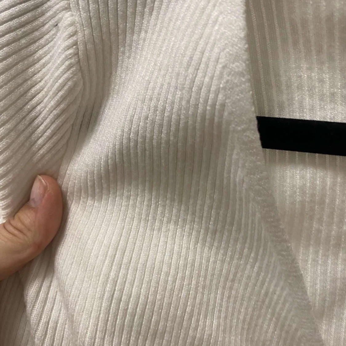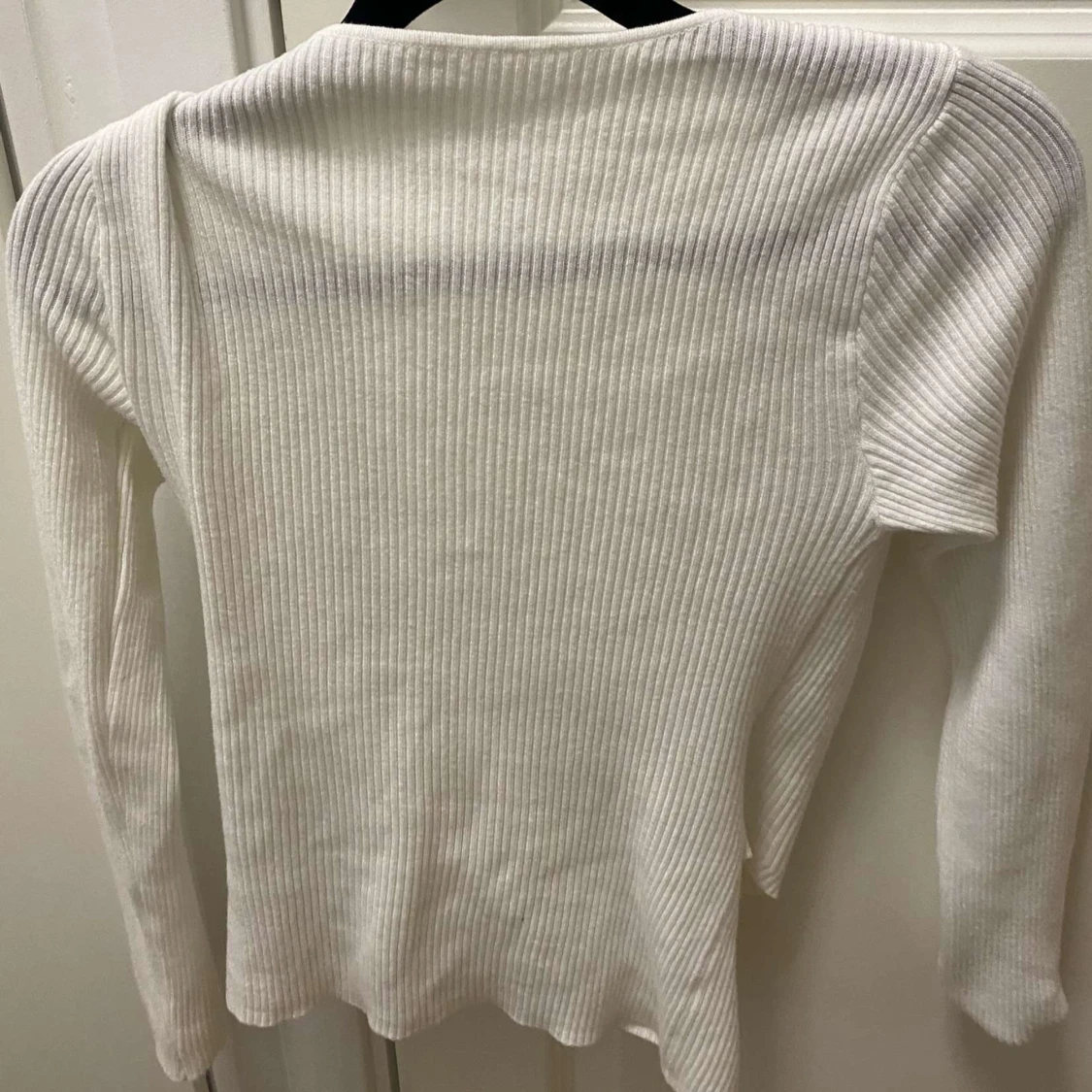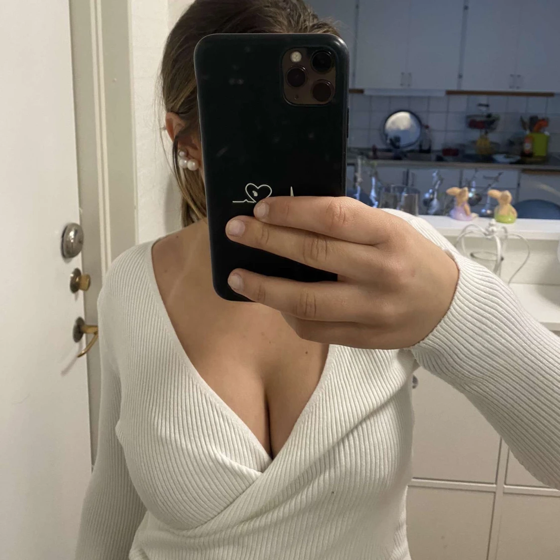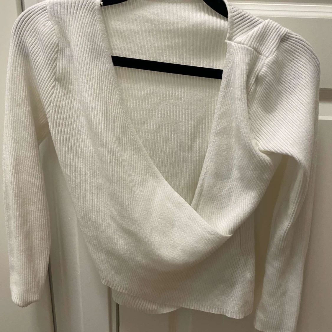 Säljer en vit omlottopp med djup v-ringning och lång ärm. Toppen är ribbad och har en croppad passform som sitter tight. Perfekt att styla med jeans eller kjol för en trendig look.