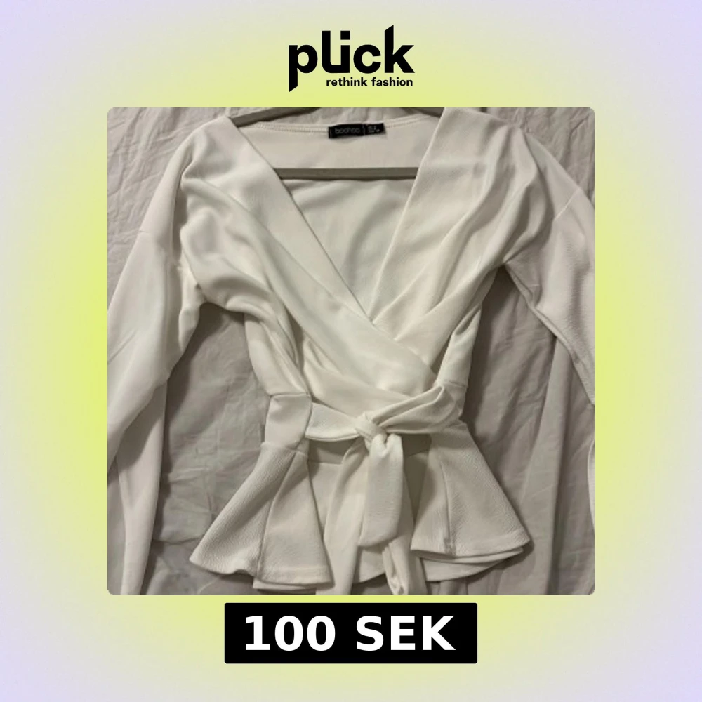 Säljer en stilren vit omlottopp från Boohoo med lång ärm och knyt i midjan. Toppen har v-ringad hals och markerad midja som ger en snygg siluett. Perfekt att styla med jeans eller kjol.
