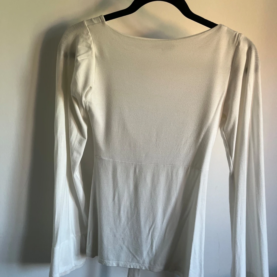 Säljer en vit långärmad omlottopp från Pieces med snygg knytning framtill. Toppen har djup v-ringning och är tillverkad i mjukt, stretchigt material som sitter skönt på kroppen. Perfekt för dig som gillar stilrena och trendiga plagg.