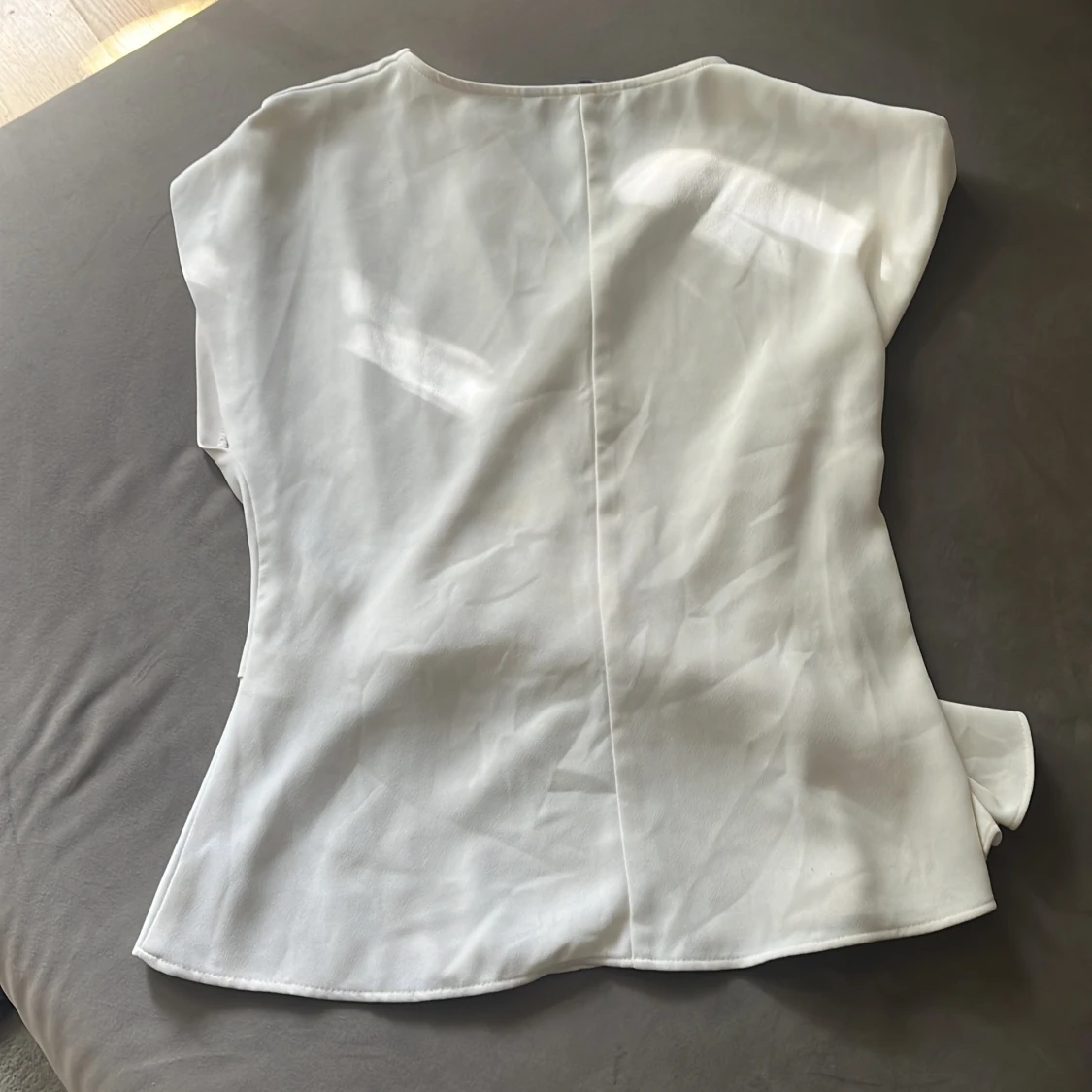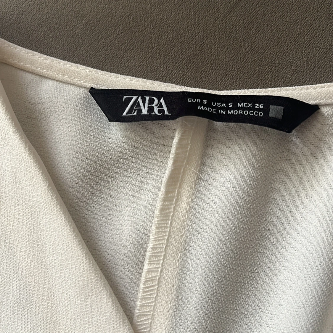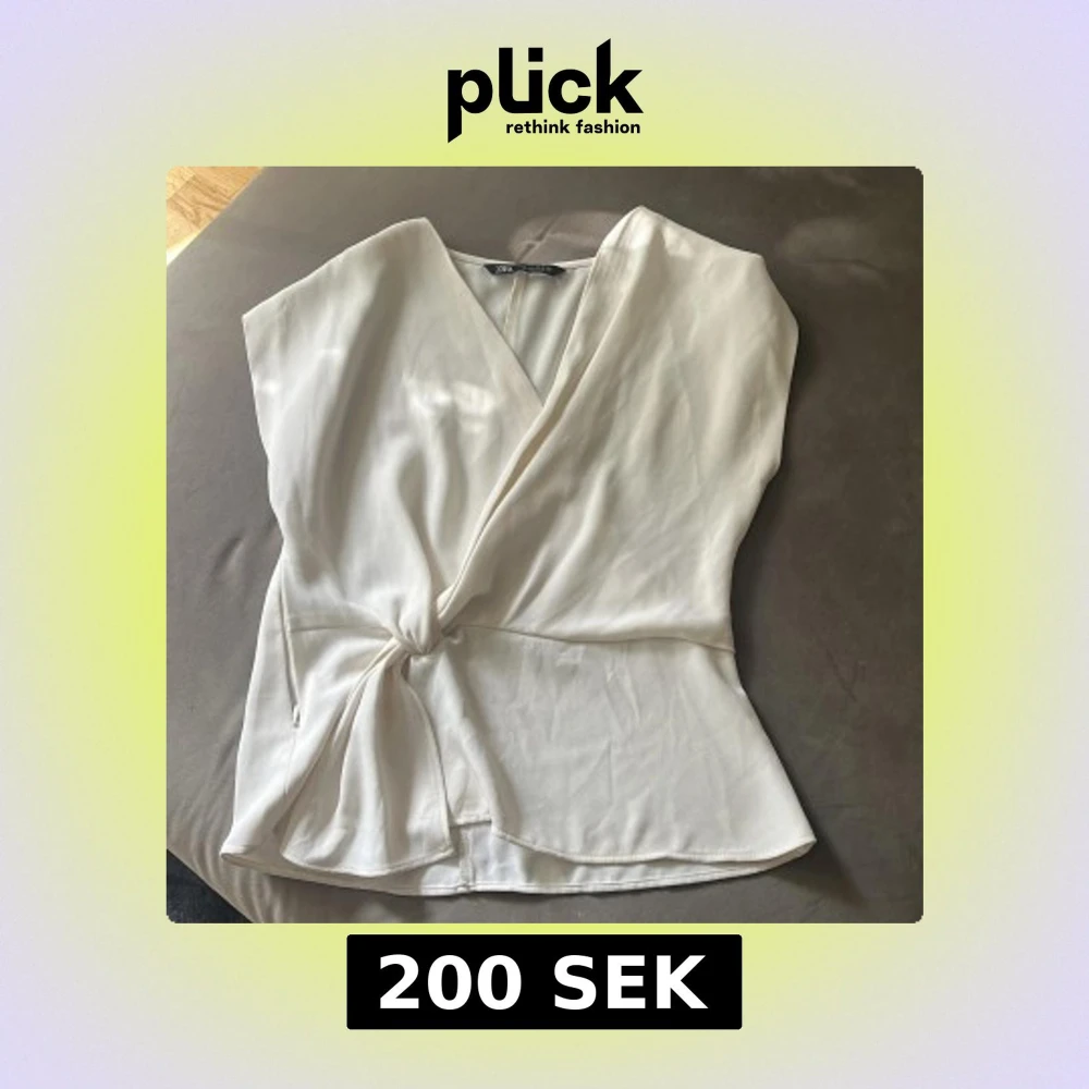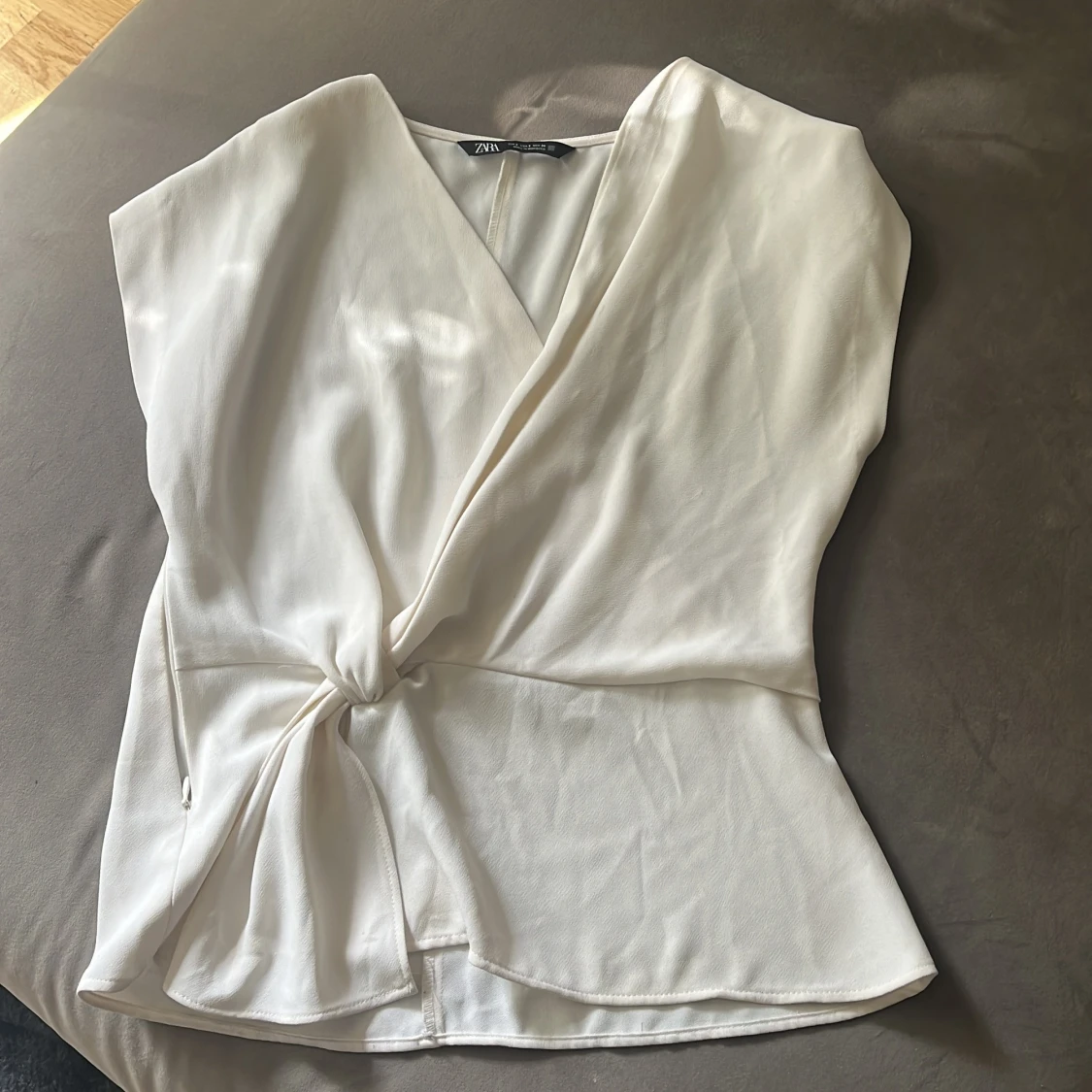 Snygg vit omlottopp från Zara i storlek S. Toppen har v-ringning, knyt i sidan och är ärmlös. Materialet är mjukt och har en lätt glansig finish som ger en lyxig känsla. Perfekt för dig som gillar stilrena och trendiga plagg.