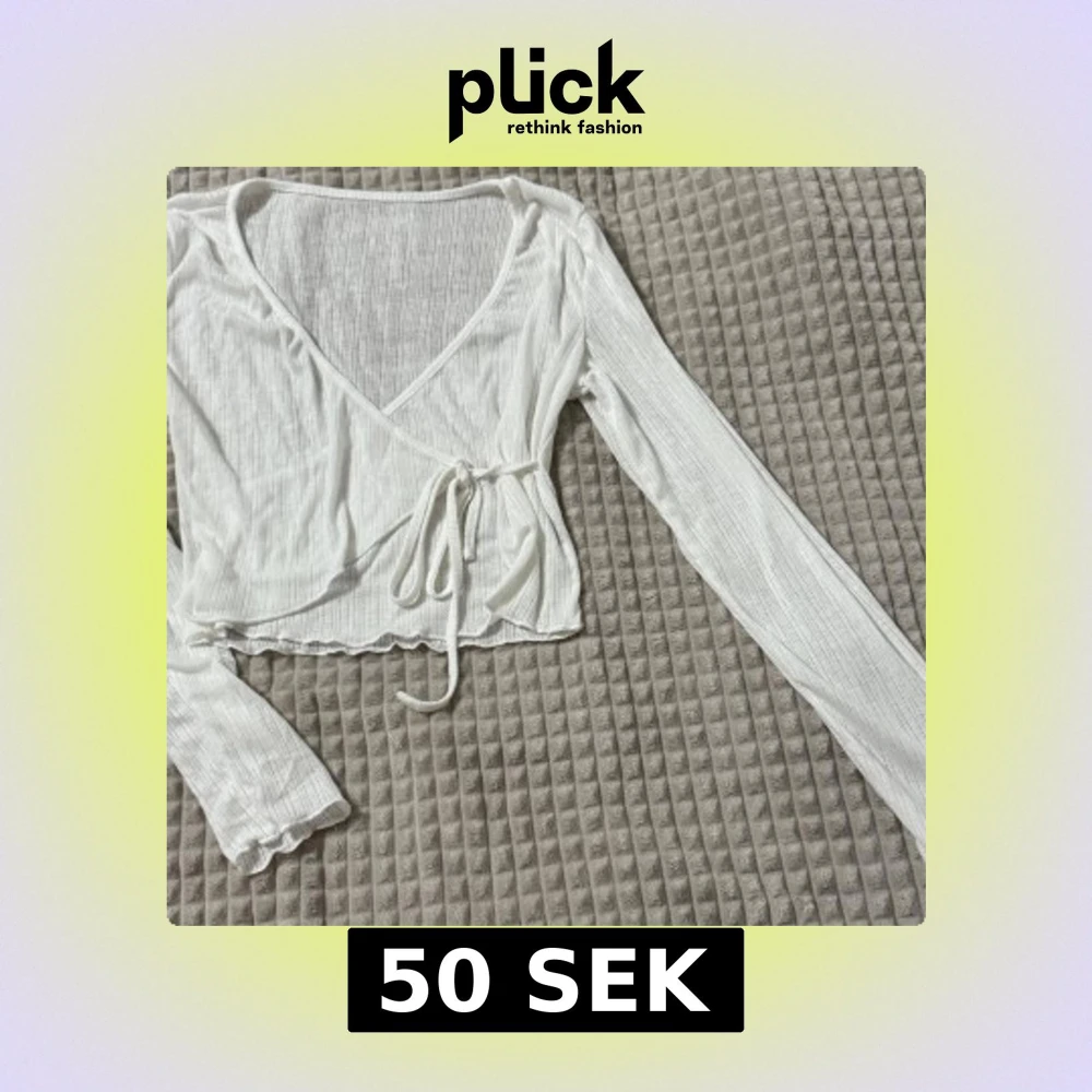 Säljer en stilren vit omlottopp med långa ärmar och knytband i midjan. Toppen är ribbad och croppad, perfekt för en trendig look. Om ni vill se den på, skriv gärna!