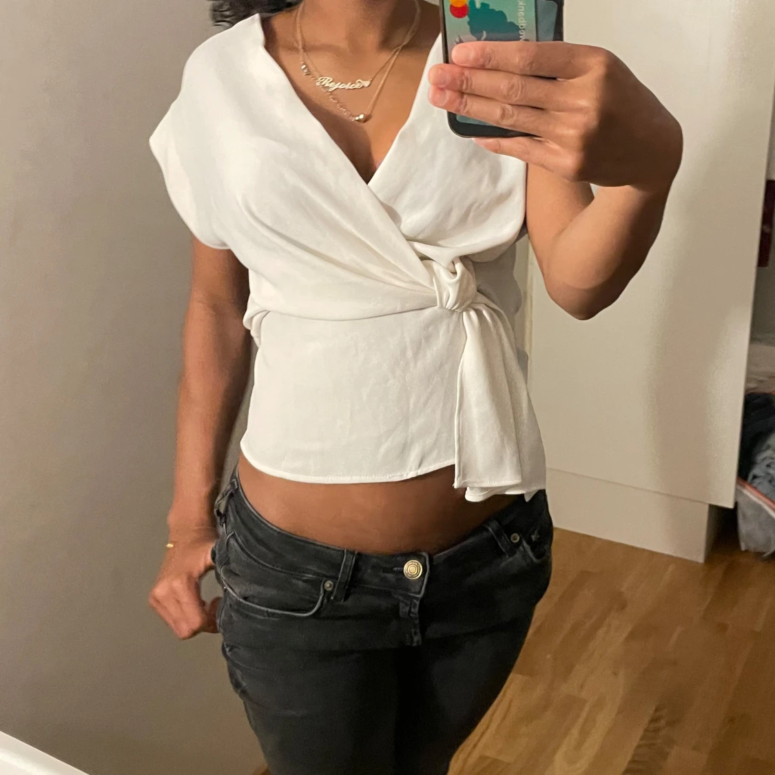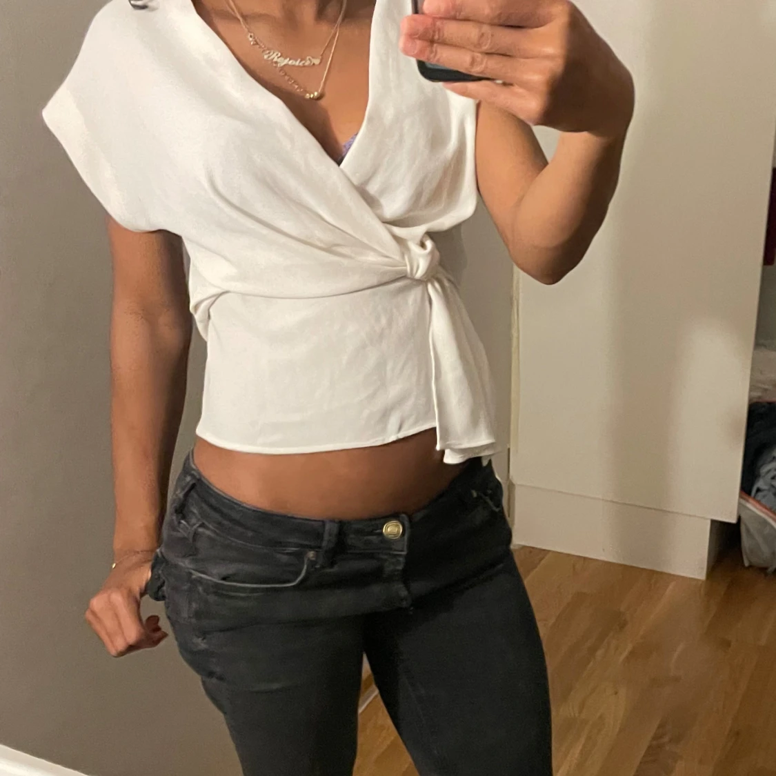 Säljer en superfin vit omlottopp med korta ärmar och knytning i sidan. Osäker på att sälja då jag köpt den nyss så buda högt