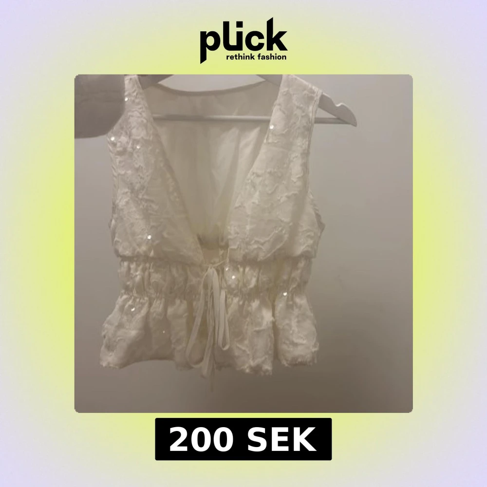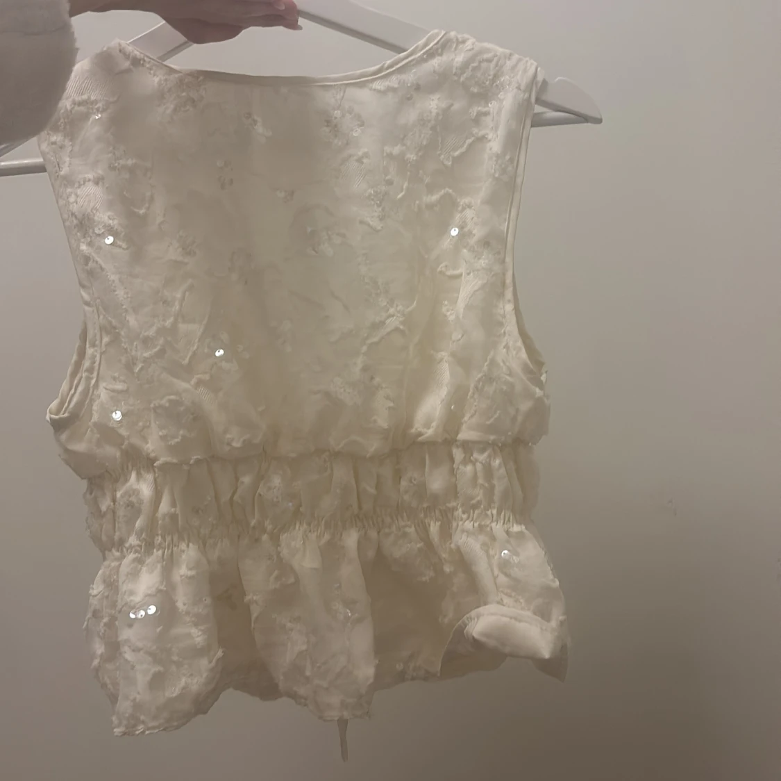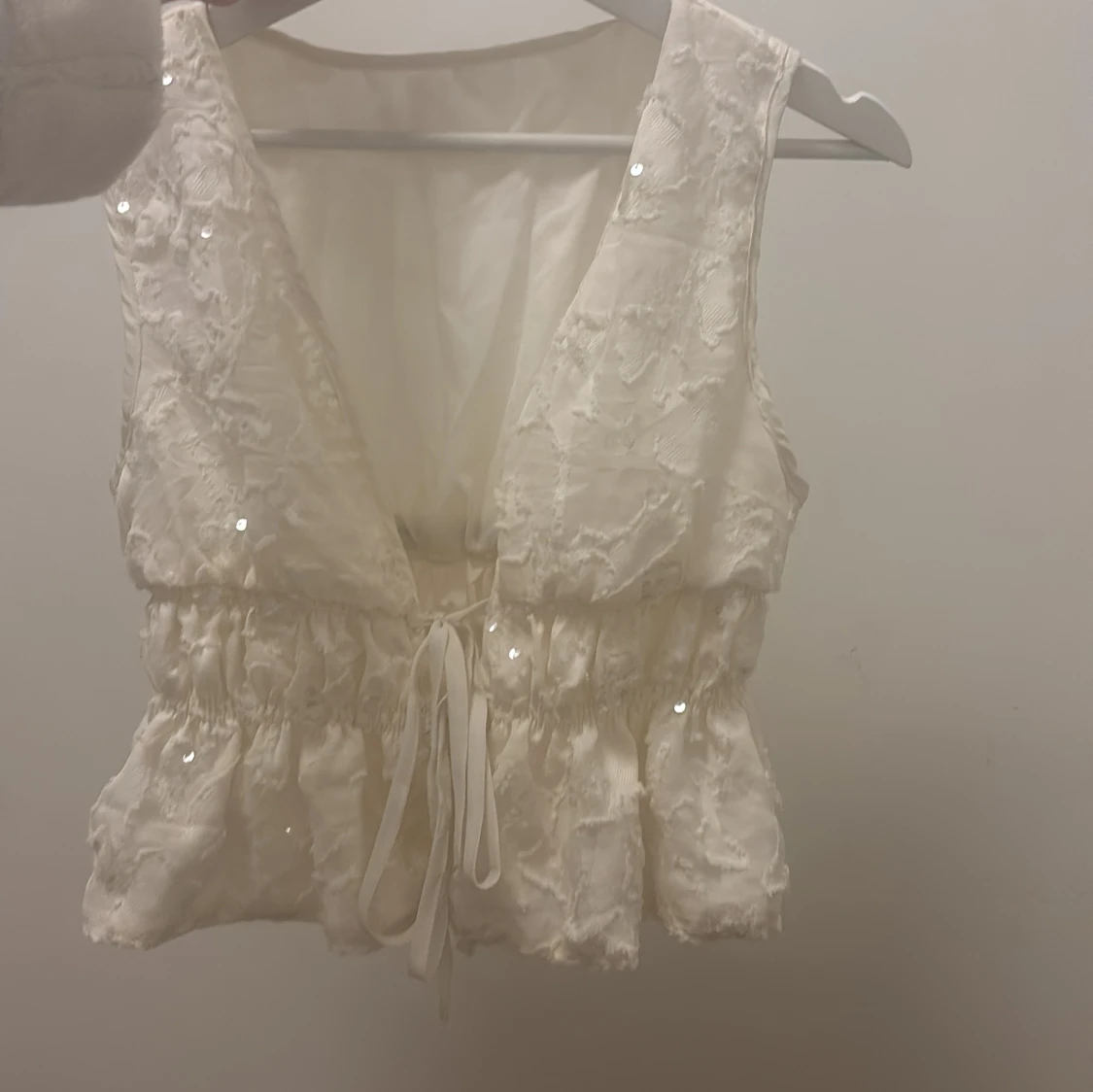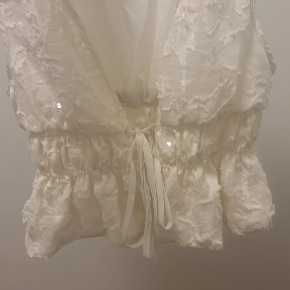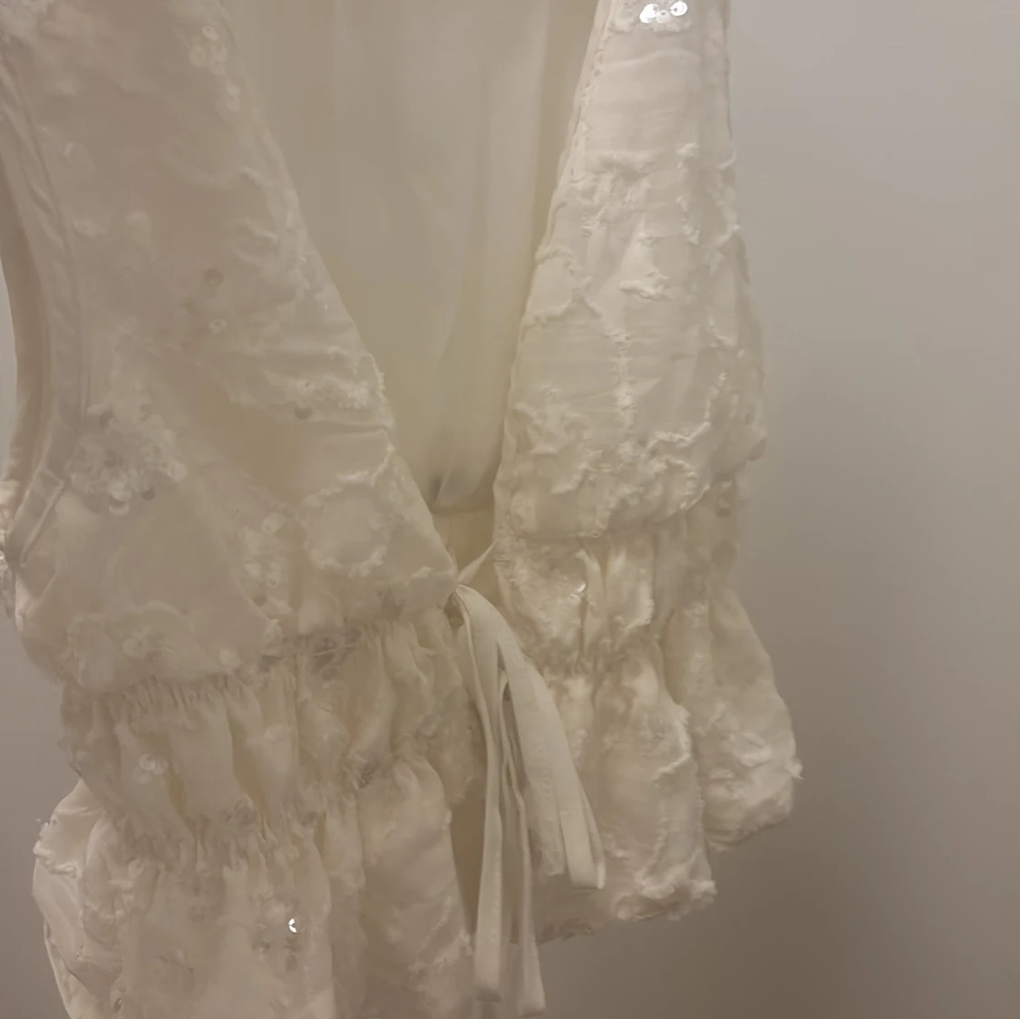 Supersöt vit omlottopp med v-ringning, knyt i midjan och glittriga paljettdetaljer. Toppens tyg har en lätt strukturerad yta med broderade inslag och volangliknande kant nedtill. Perfekt för dig som gillar romantiska och unika plagg.