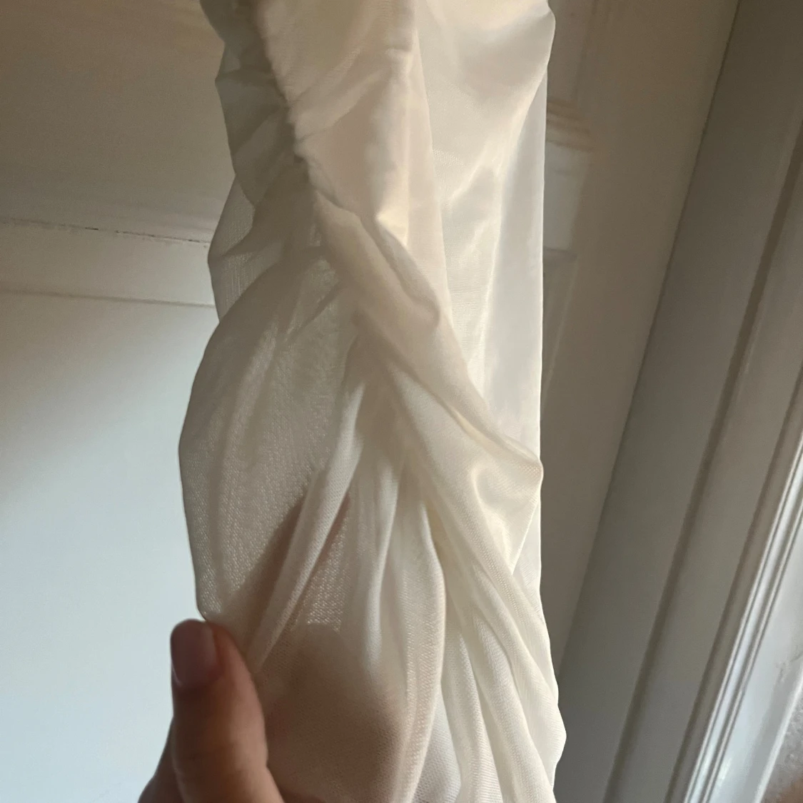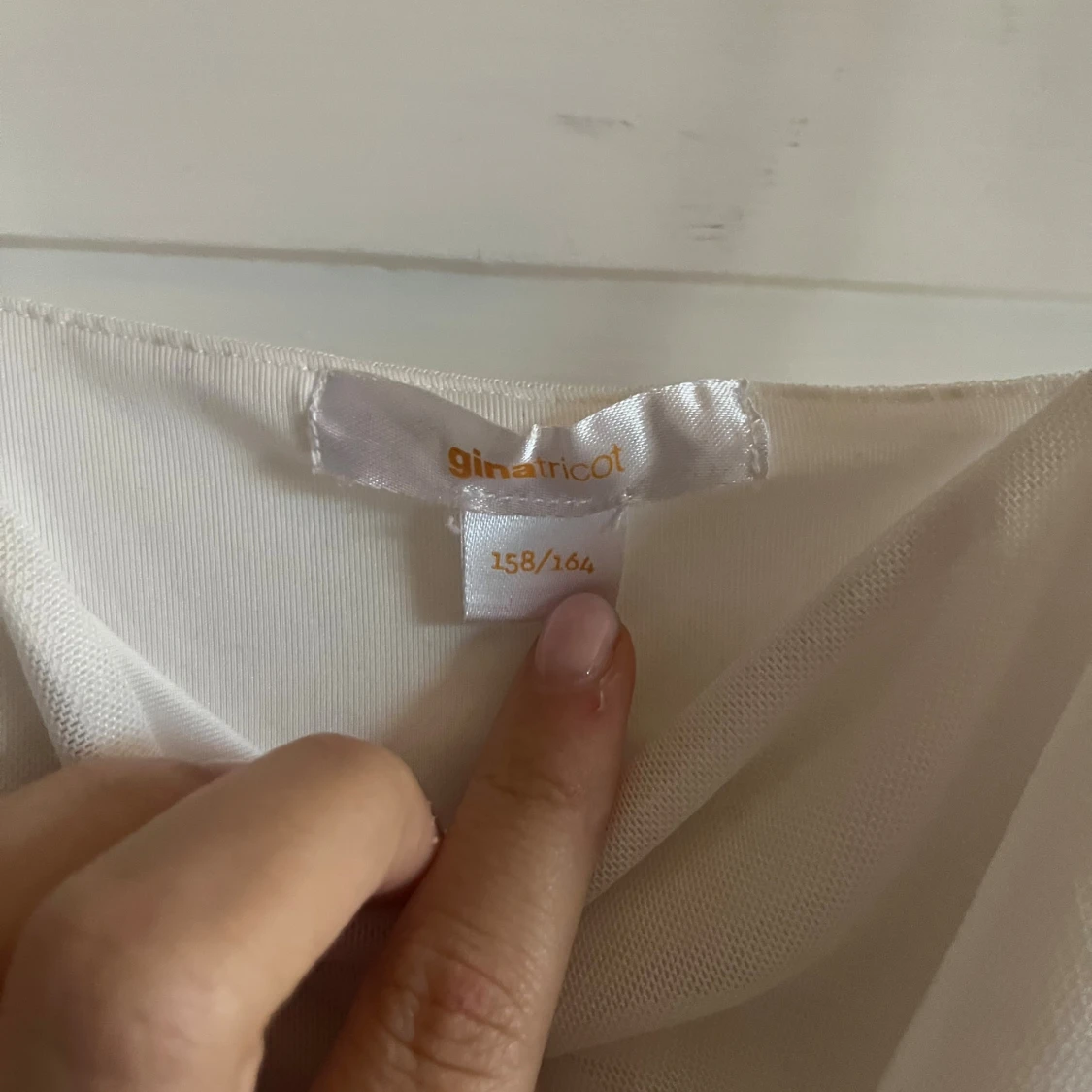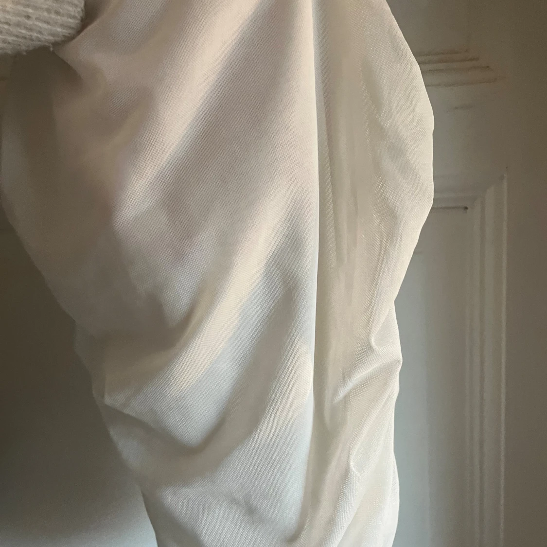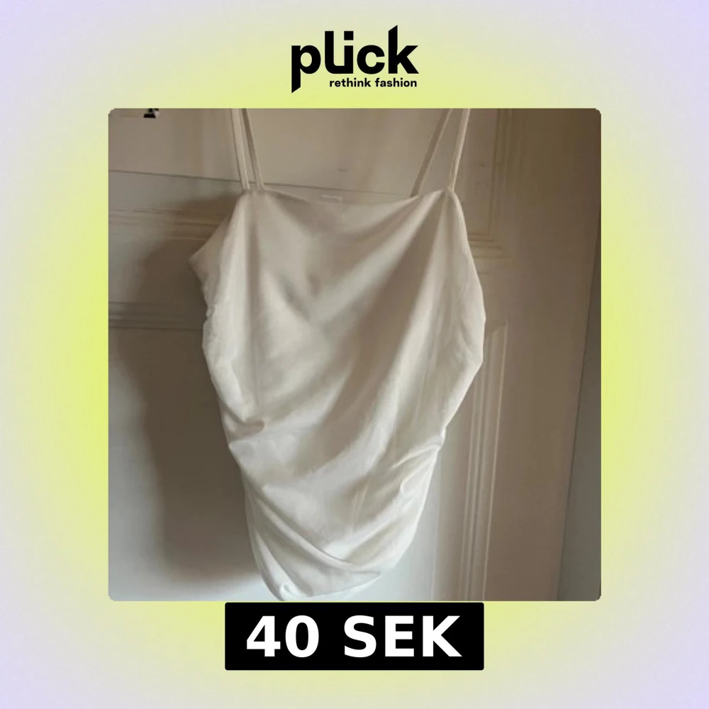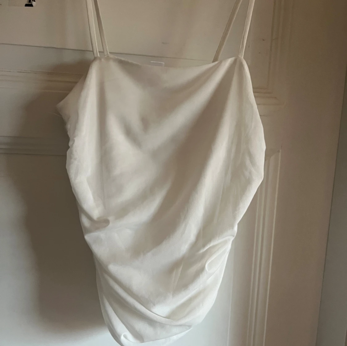 Supersnygg vit tröja från Gina Tricot med tunna axelband och draperad omlott-effekt. Tröjan har en lätt glansig yta och är gjord i ett tunt, mjukt material som känns lyxigt. Perfekt för dig som gillar stilrena och trendiga plagg.