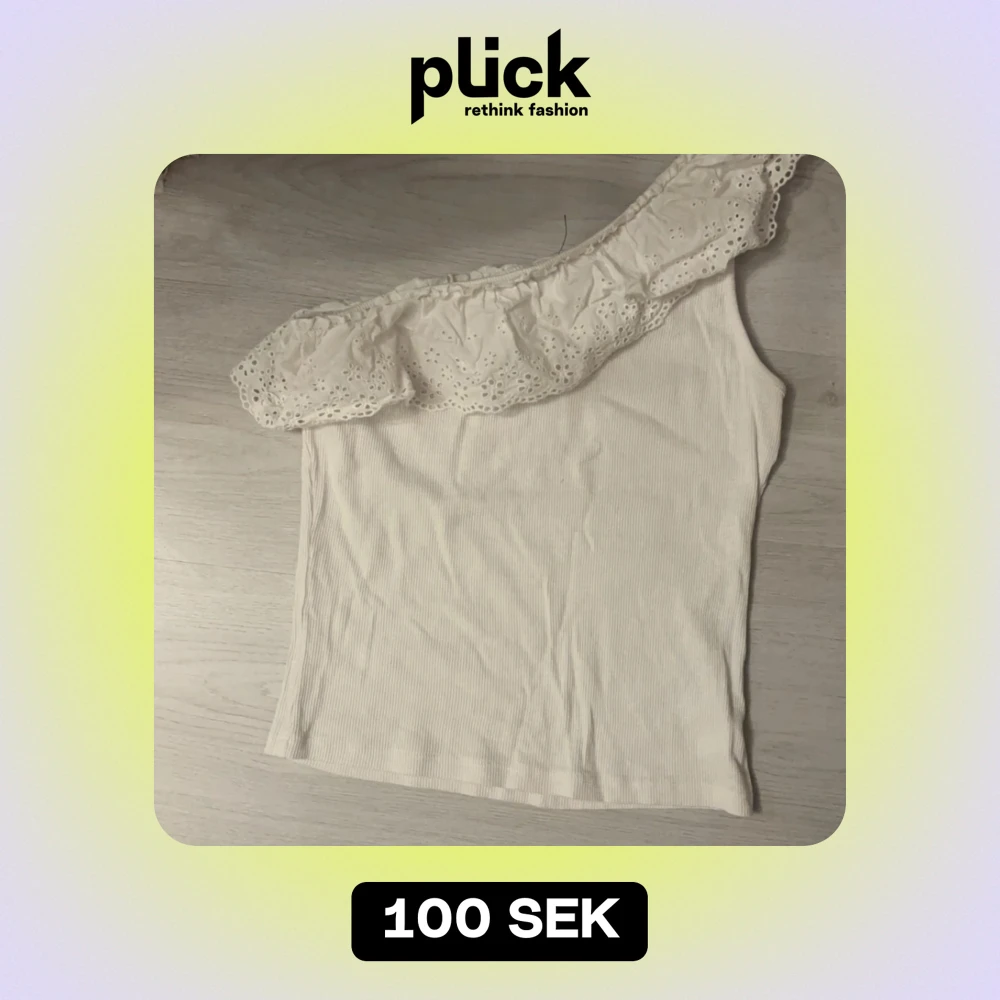 Säljer en superfin vit oneshoulder topp från Kappahl. Den har en söt volangdetalj längs axeln och är ribbad för en skön passform. Perfekt för sommarens alla fester eller bara en solig dag ute. 🕶️