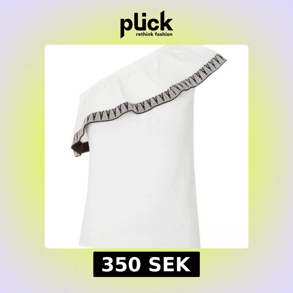 Snygg vit oneshoulder topp från Maje med volangdetalj och svart mönstrad kant. Toppen är i ett mjukt material som ger en bekväm passform. Pris kan diskuteras.
