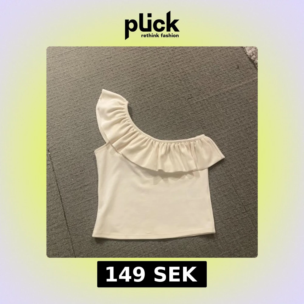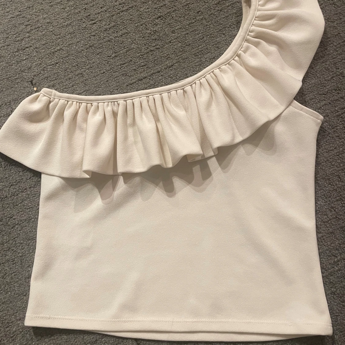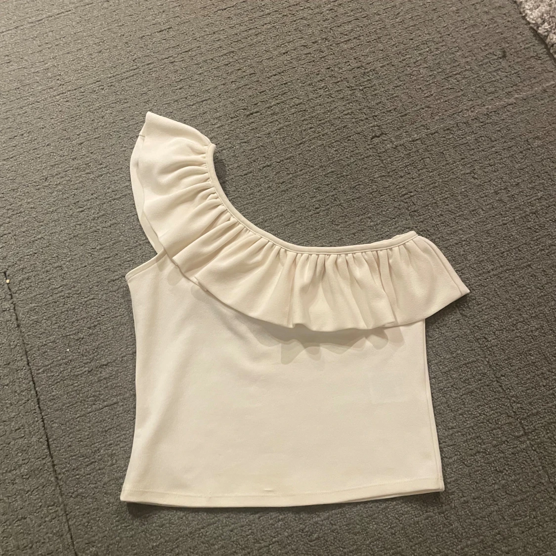 Säljer en vit oneshoulder topp med volang, passar bra både till vardags och till fester, använt endast 2-3 gånger, mycket bra kvalitet.