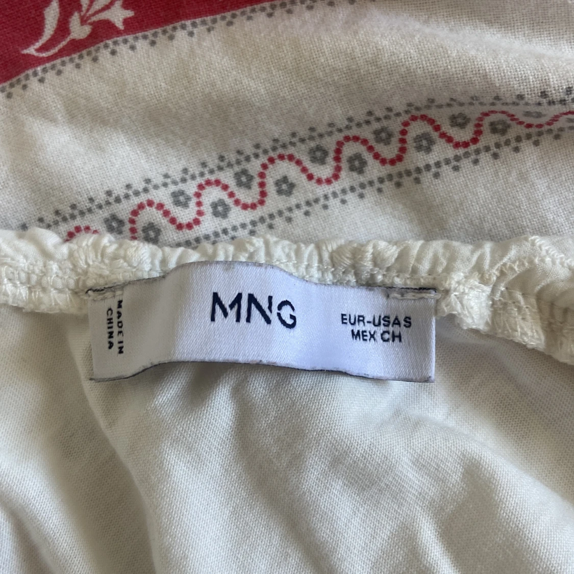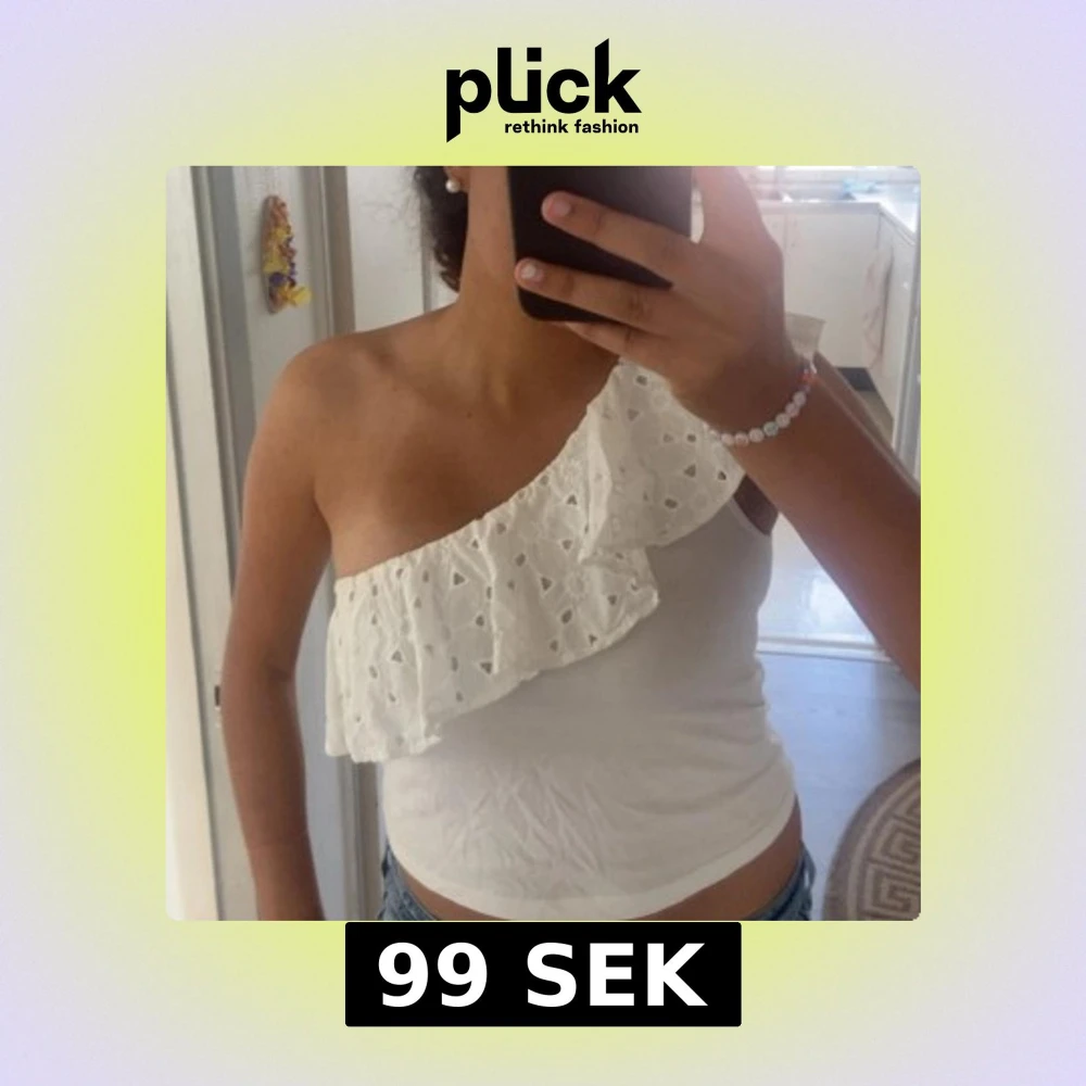 Säljer en vit oneshoulder topp från Mango med bred volang och broderade hål längs kanten. Toppen är ärmlös och har en snygg asymmetrisk skärning. Perfekt till jeans eller kjol för en fräsch look.