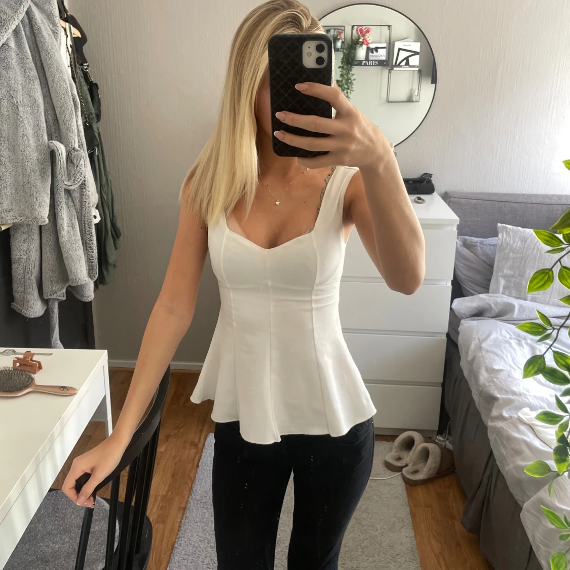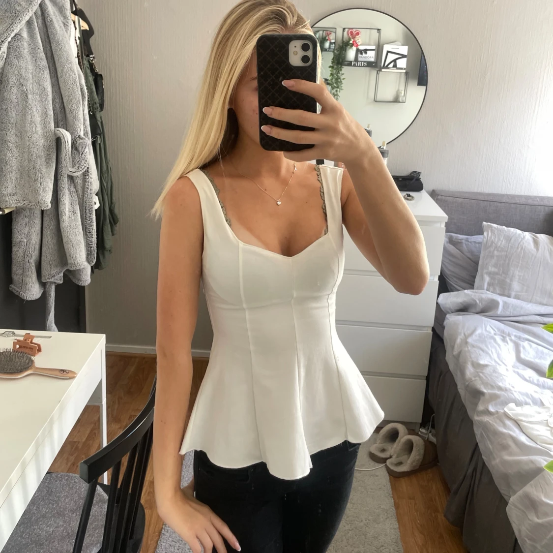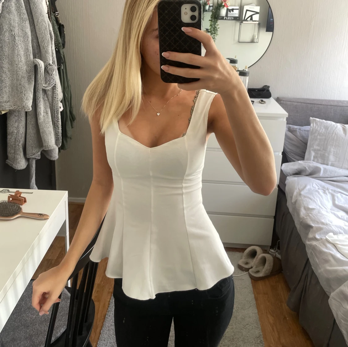 Snygg vit linnetopp med peplumskärning och breda axelband. Toppen har en markerad midja och lätt utsvängd nederdel som ger en feminin siluett. Söt hjärtformad ringning framtill. Perfekt att styla med jeans eller kjol för en fräsch look.
