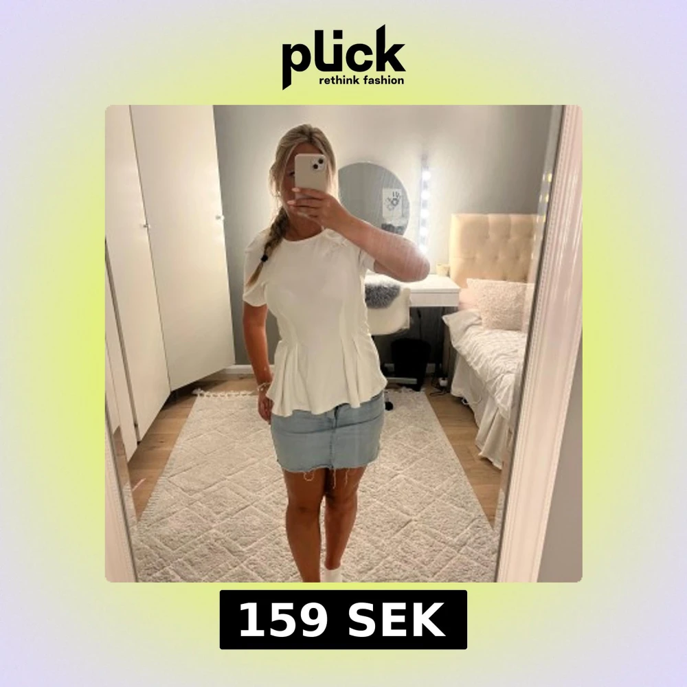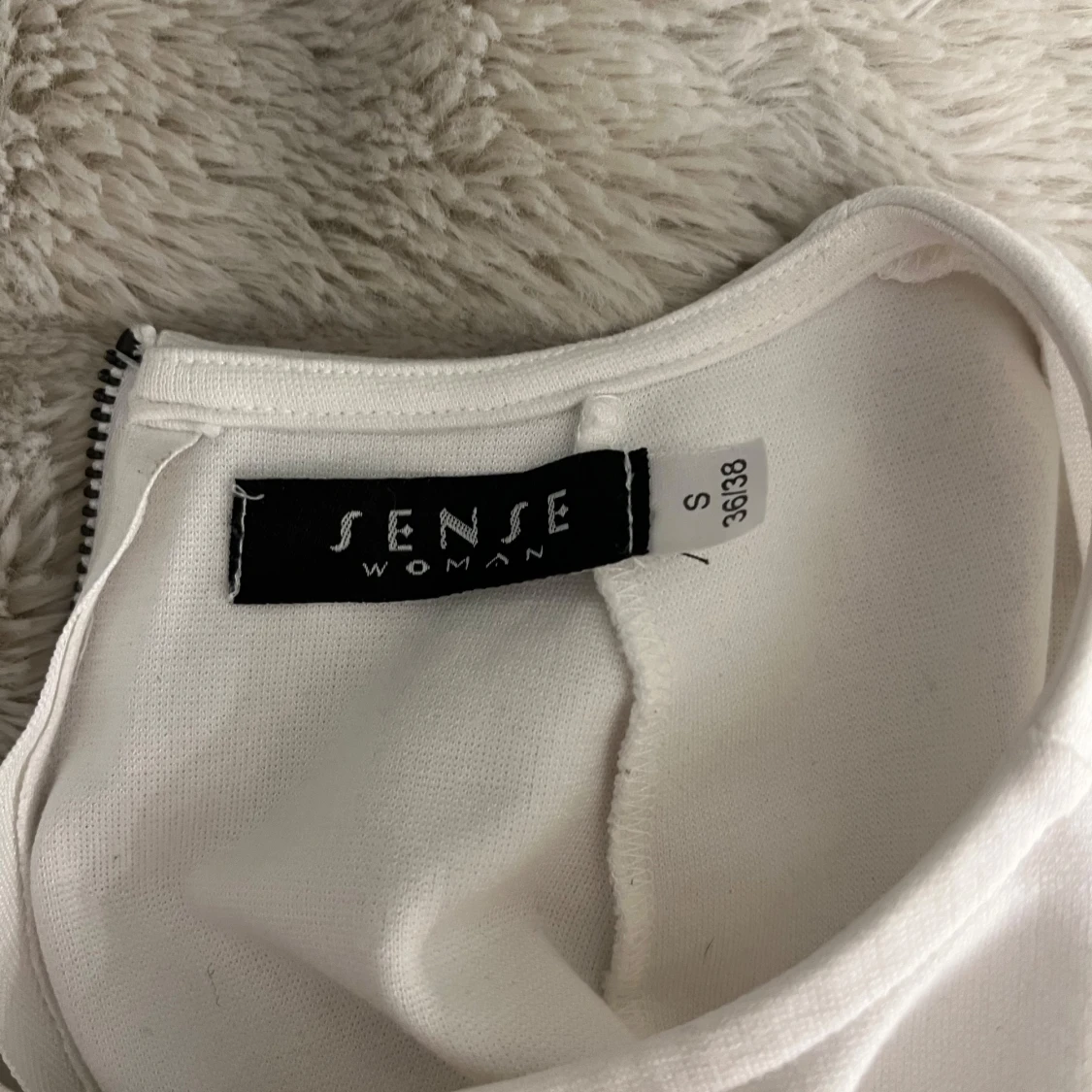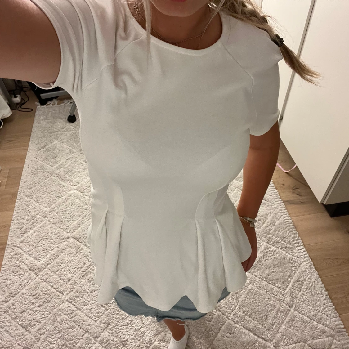 Supersöt vit peplumtop från Sense Woman med korta ärmar och rund hals. Toppen har figurnära passform upptill och volangliknande peplum nedtill som ger en snygg siluett. Perfekt att styla med jeans eller kjol för en fräsch look.