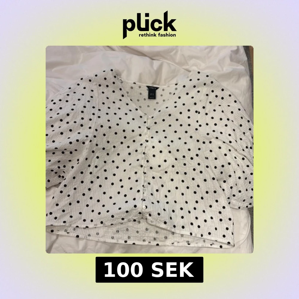 Supersöt vit blus från Lindex med svarta prickar, v-ringning och knappar framtill. Blusen har puffiga, trekvartsärmar och är tillverkad i ett lätt bomullstyg med diskreta ränder. Säljer den pgr av att den tyvärr är för stor för mig