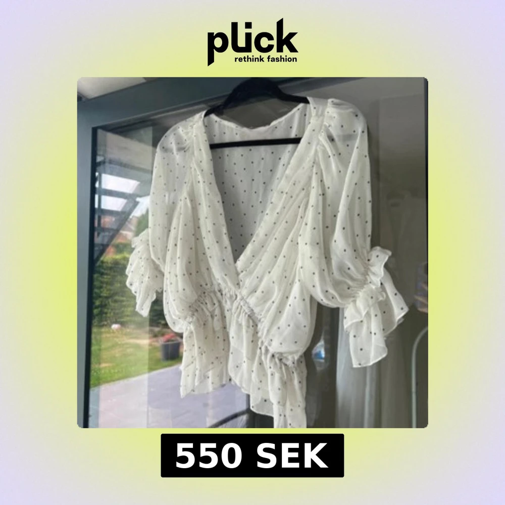 Supersöt vit blus med svarta prickar och volangdetaljer. Blusen har trekvartsärmar med resår och volang, samt v-ringning och resår i midjan. Storlek S , köpt på en mini boutique i marbella , super bra skick nypris 1200 ☺️