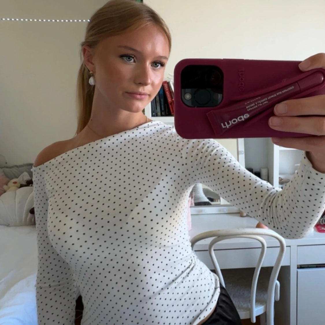 Säljer en vit långärmad topp med svarta prickar och en snygg offshoulder-skärning. Toppen är figurnära och har en klassisk, stilren look som passar perfekt till jeans eller kjol. Materialet känns mjukt och stretchigt, vilket gör den bekväm att bära hela dagen.
