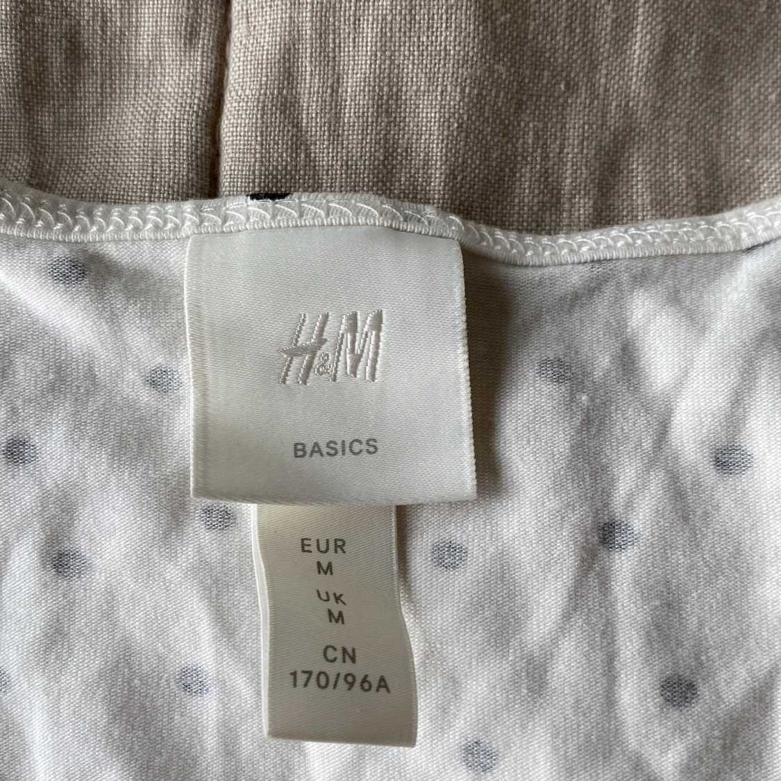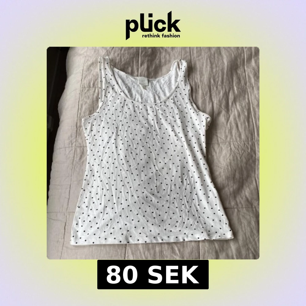 Säljer en vit linnetopp från H&M med svarta prickar över hela tyget. Toppen är ärmlös med klassisk rund halsringning och tillverkad i mjuk bomull. Perfekt för en enkel och stilren look.