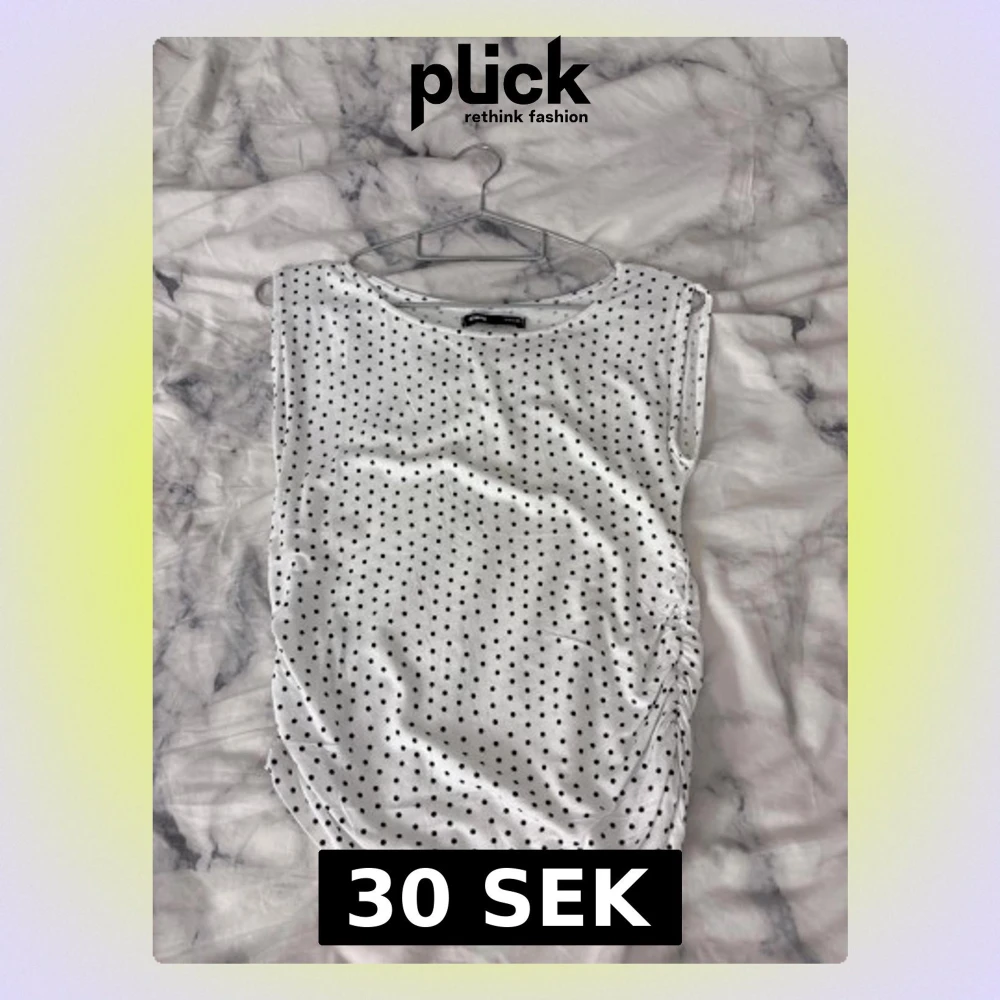 Vit ärmlös topp från Sinsay i storlek XS med svarta prickar och snygg rynkdetalj på sidan. Toppen har rund halsringning och är gjord i mjukt bomullsmaterial. Perfekt för dig som gillar en lekfull och trendig stil.