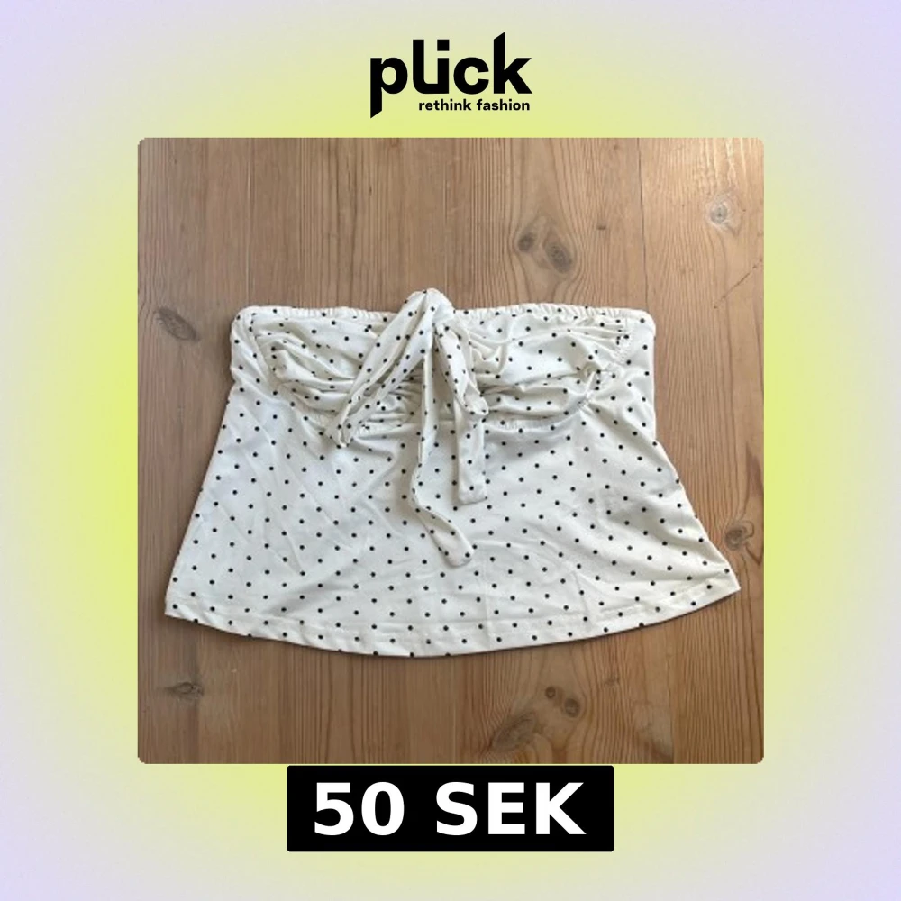 Supersöt vit tubtopp med svarta prickar och knyt framtill. Toppen är bandeau-modell och har en lätt rynkad detalj vid bysten. Aldrig använd för tyckte inte den passade på mig, däremot tvättad en gång❣️