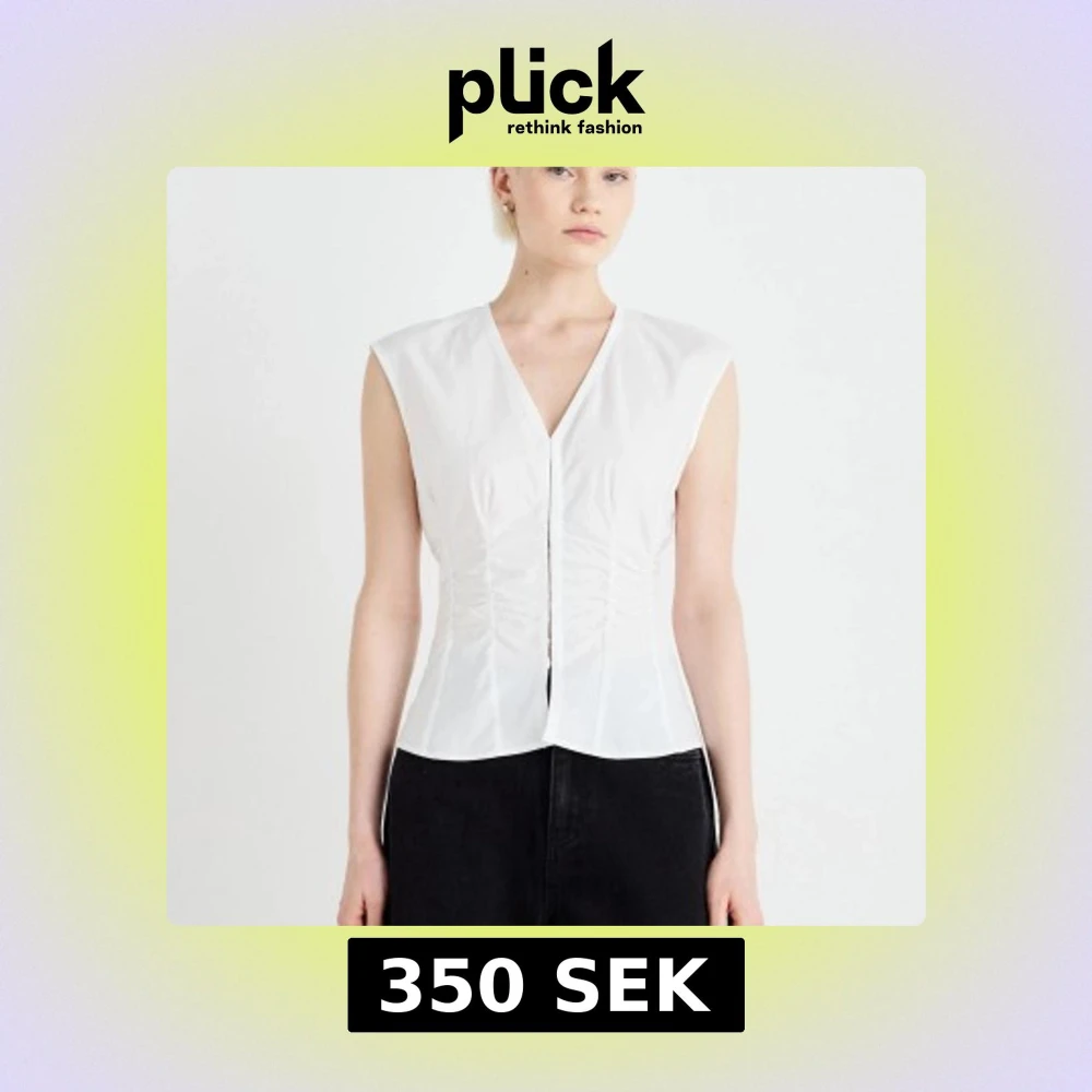 Snygg vit randiga blus med v-ringning och markerad midja. Ärmlös design och stilren passform som ger en elegant siluett. Perfekt att matcha med både kjol och byxor för en trendig look.