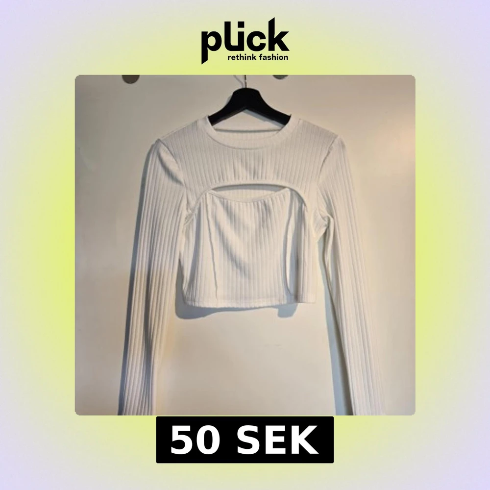 Säljer en vit ribbad långärmad topp med croppad passform och en cool cut-out detalj framtill. Toppen har rund halsringning och är tillverkad i ett stretchigt material som sitter snyggt på kroppen. Perfekt att styla med höga jeans eller kjol.