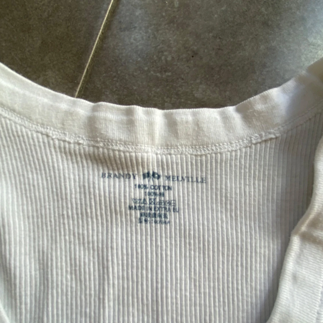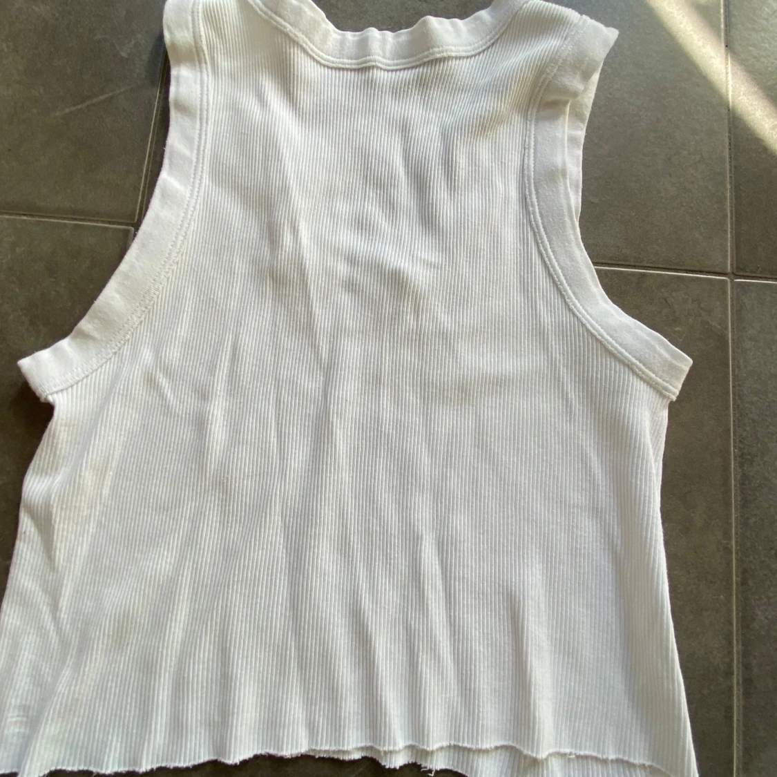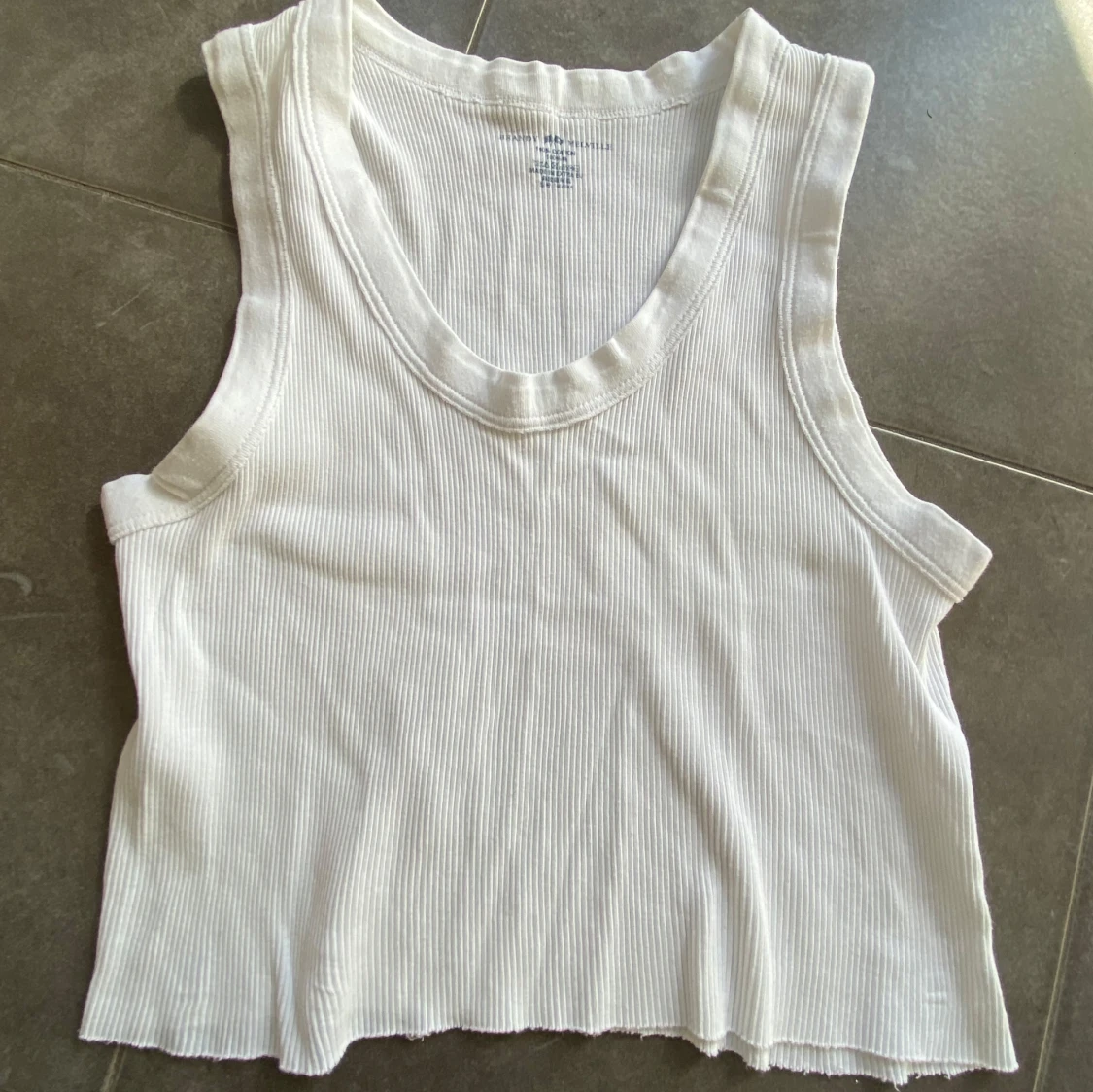 Säljer en vit ribbad croppad bomullstopp från Brandy Melville. Toppen är ärmlös med rund halsringning och har en avslappnad passform. Perfekt för varma dagar eller som layering-piece.