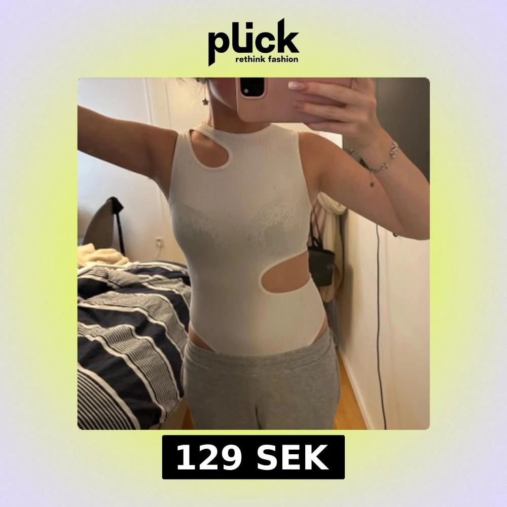 Säljer en vit ribbad body med coola cut out-detaljer vid axel och midja. Toppen är ärmlös och har en tight passform som framhäver figuren. Perfekt för dig som vill sticka ut med en trendig och edgy look.