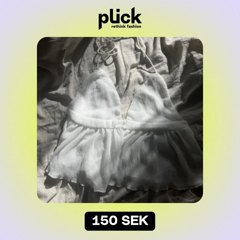 Säljer en superfin vit ribbad halterneck topp. Den är ärmlös och har en snygg knytning i nacken. Perfekt för sommardagar eller en festkväll. Toppen har en luftig och lätt känsla, öppen rygg. Toppen är oanvänd
