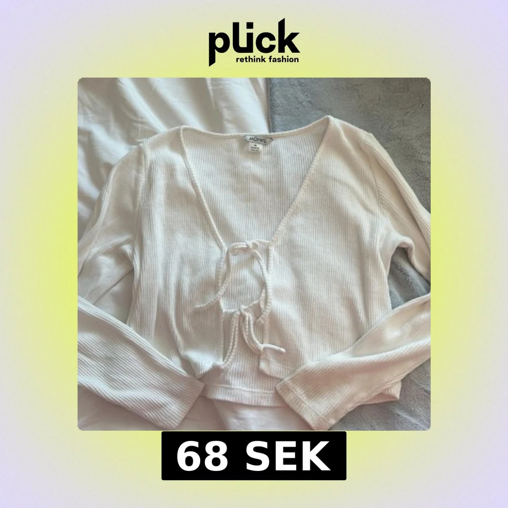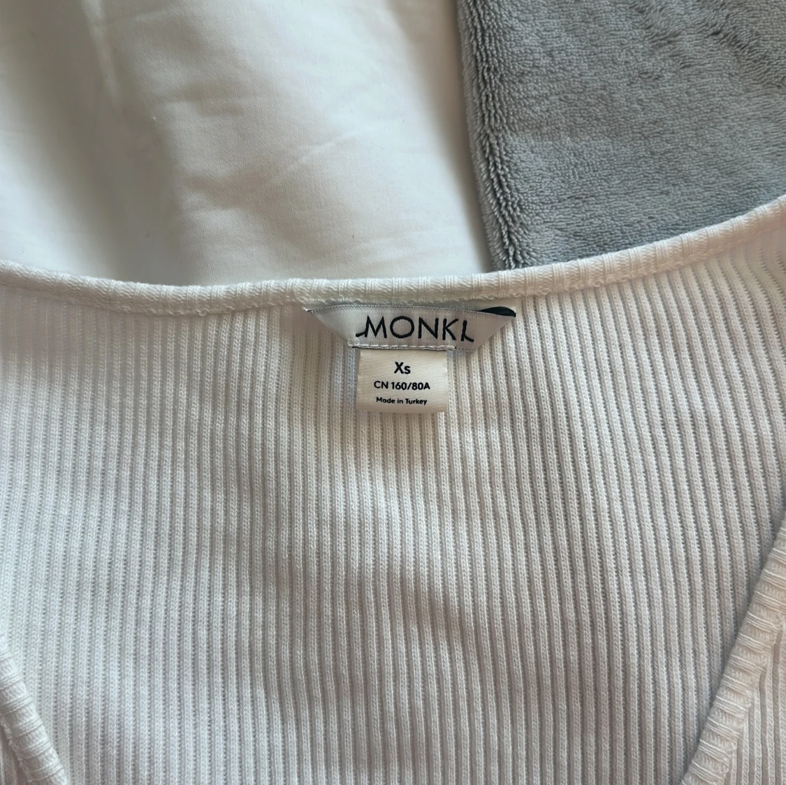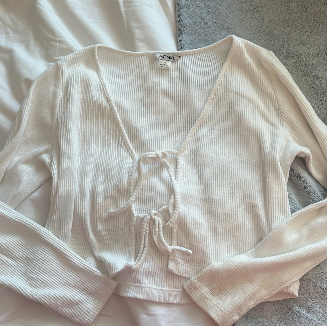 Säljer en vit ribbad topp från Monki med lång ärm och v-ringning. Toppen har snygga knytband framtill och är croppad i modellen. Perfekt för att styla med jeans eller kjol.