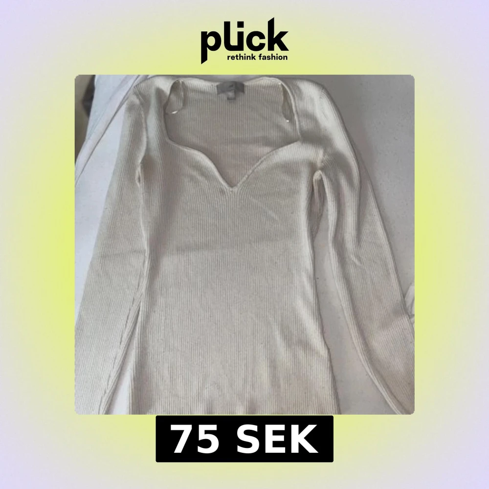 Säljer en vit ribbad topp från H&M med lång ärm och snygg v-ringad hals. Modellen är slim och sitter tajt mot kroppen, perfekt för dig som gillar en clean och stilren look. Materialet är mjukt och stretchigt, vilket gör den skön att bära hela dagen.