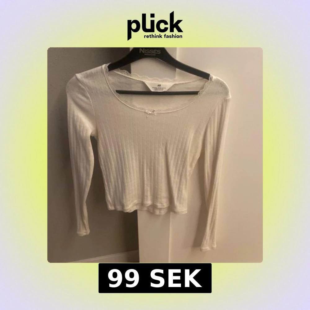 Supersöt vit ribbad topp från H&M med lång ärm, spetskant vid halsen och en liten rosett framtill.
