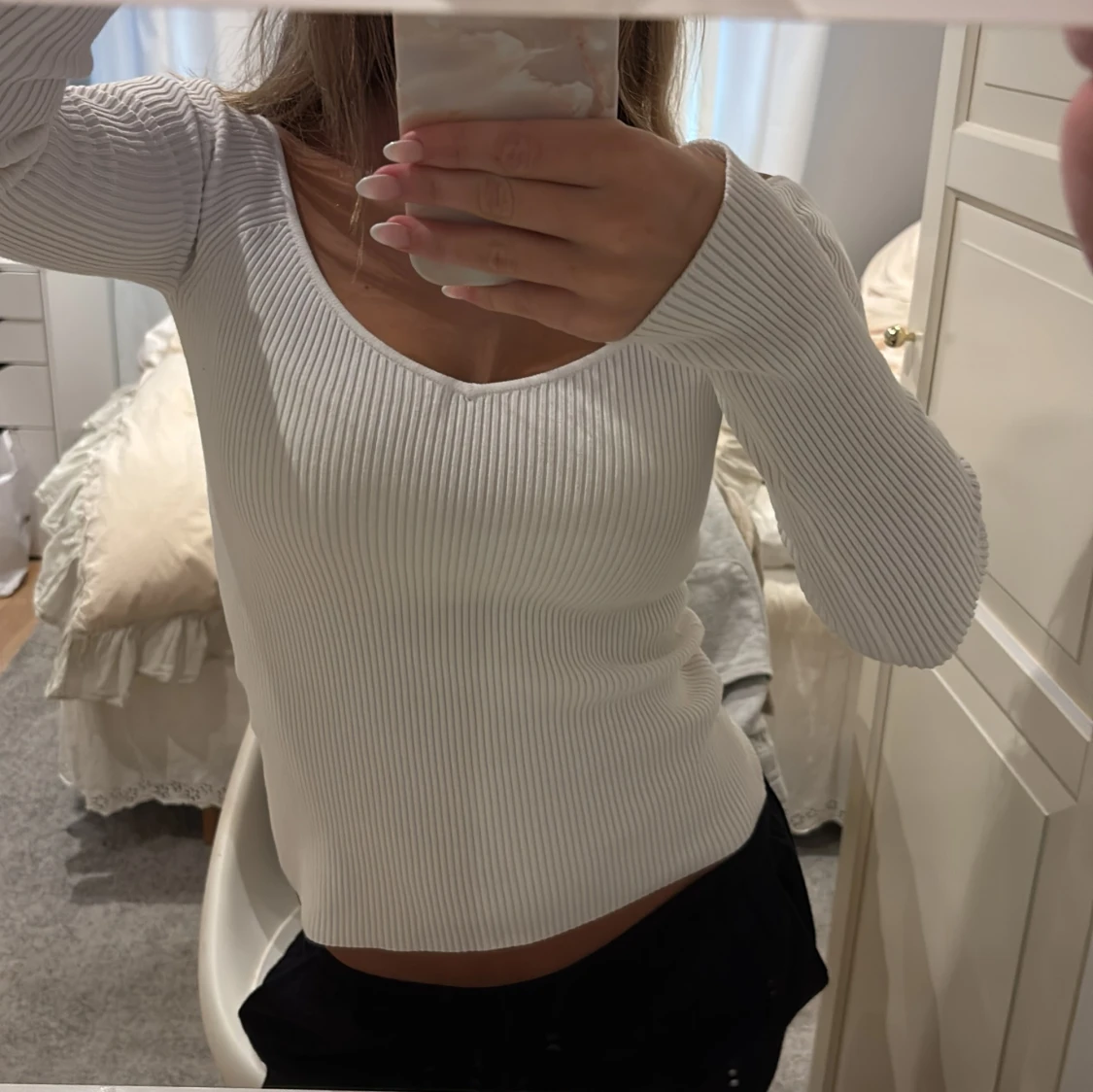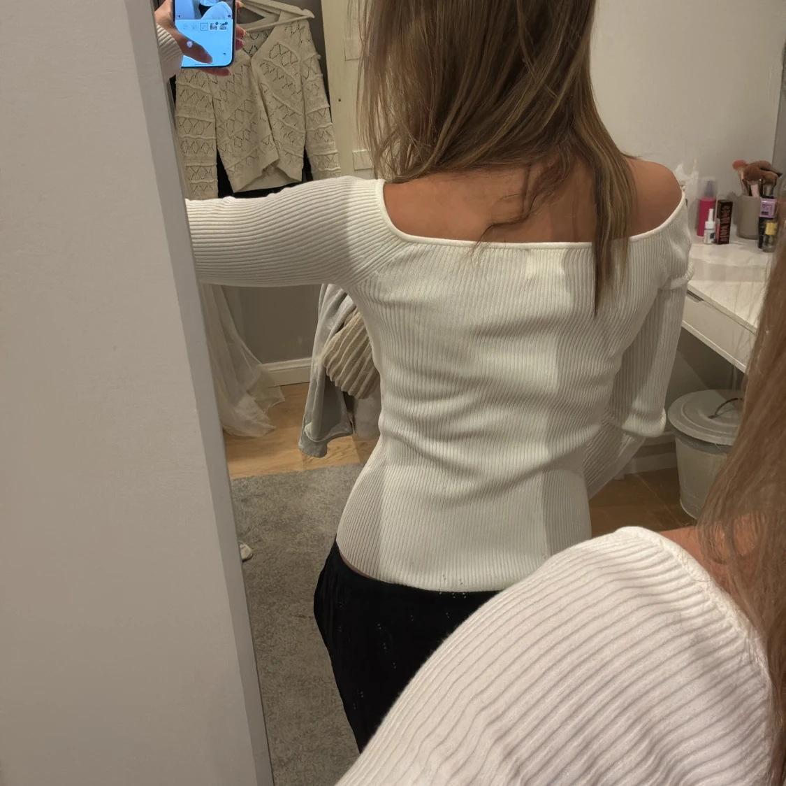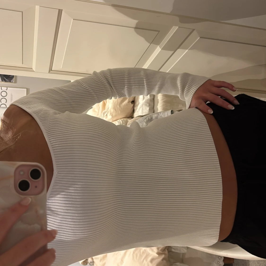 Säljer en vit ribbad topp med v-ringning och lång ärm. Toppen är figurnära och har offshoulder-design som visar axlarna. Materialet är stretchigt och bekvämt.