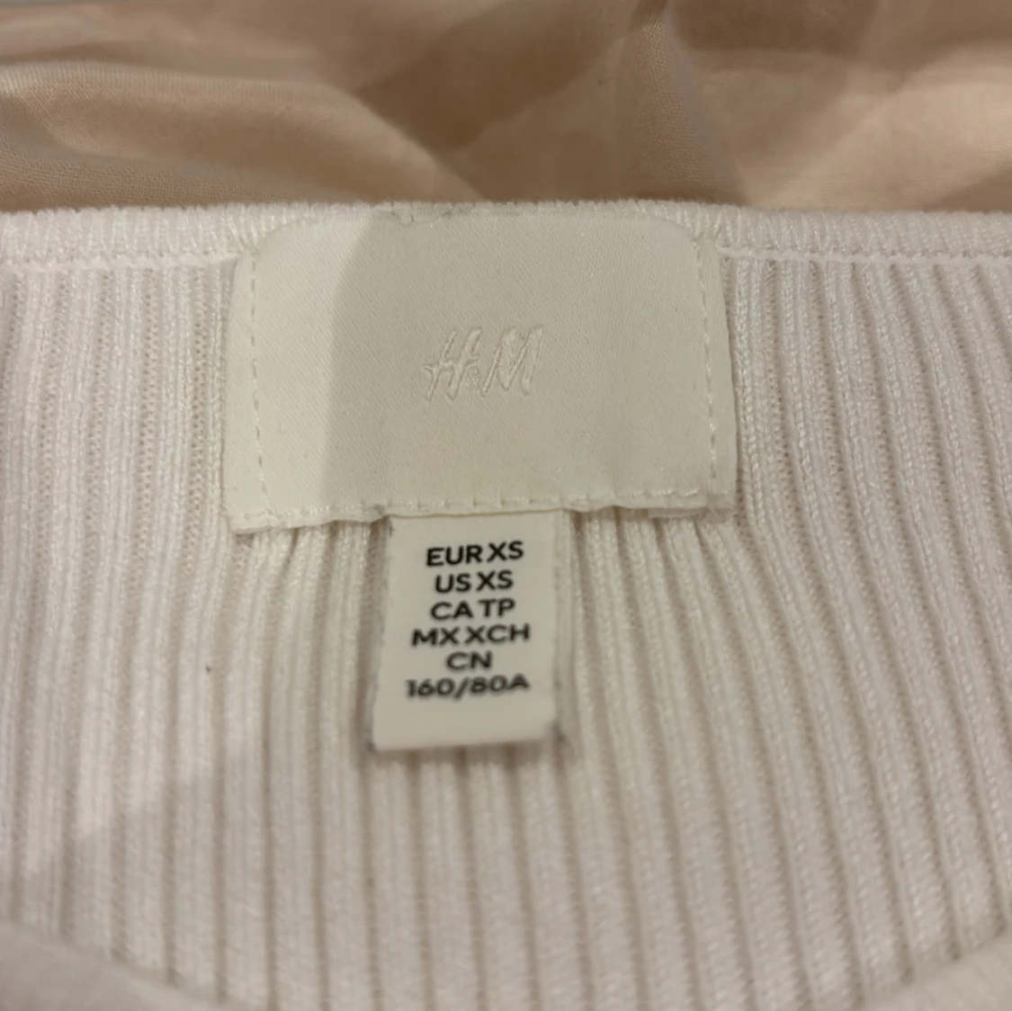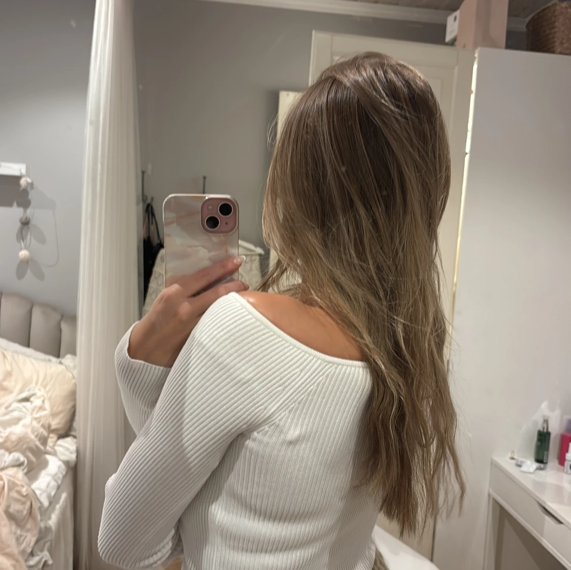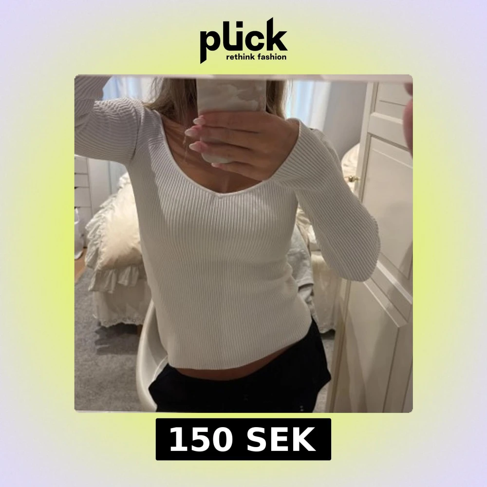 Säljer en vit ribbad topp med v-ringning och lång ärm. Toppen är figurnära och har offshoulder-design som visar axlarna. Materialet är stretchigt och bekvämt.