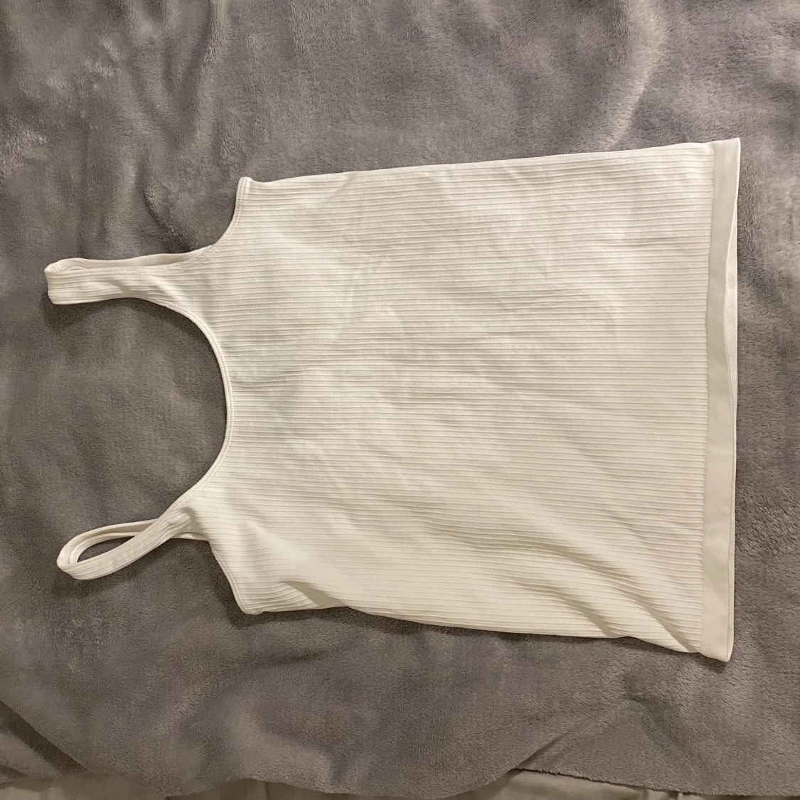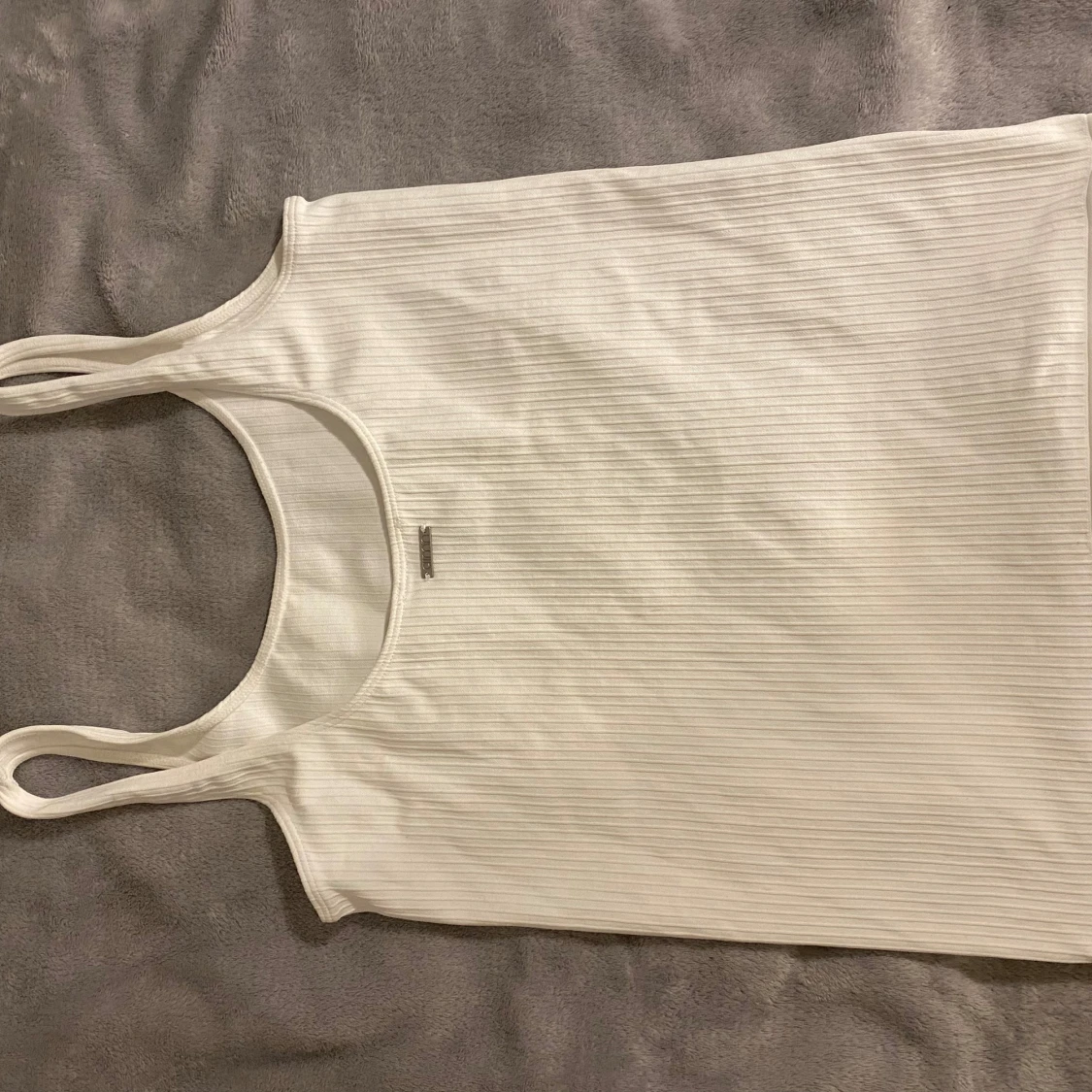 Säljer en stilren vit ribbad linnetopp med smala axelband. Den passar till en vanlig outfit men oxå till träning eller gym, aldrig använt men provat en gång och väldigt bra matrial