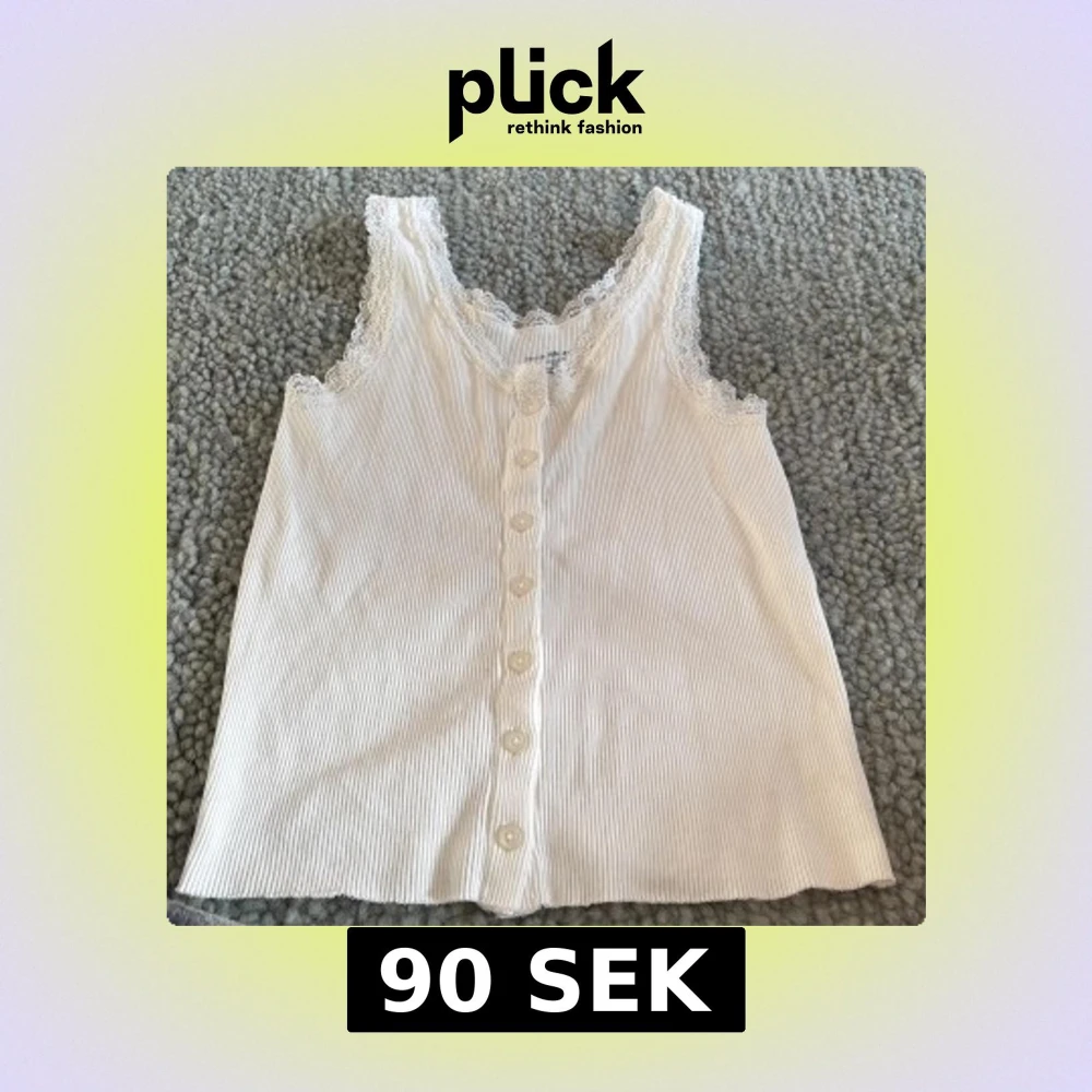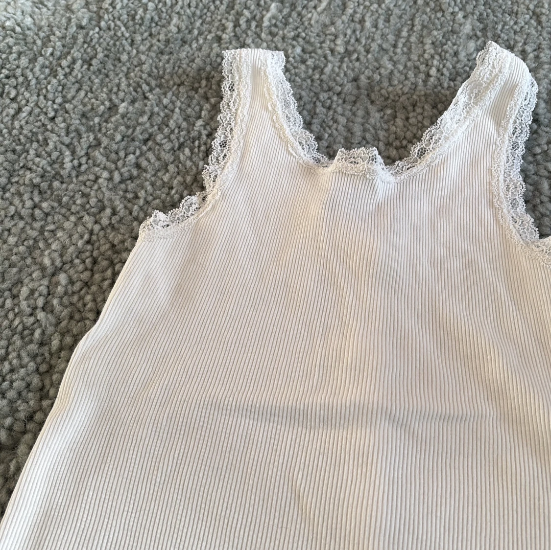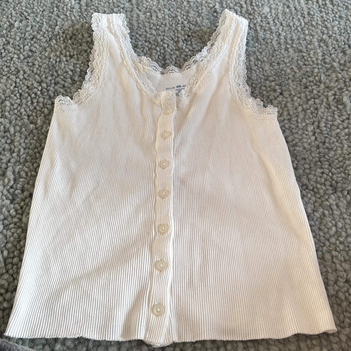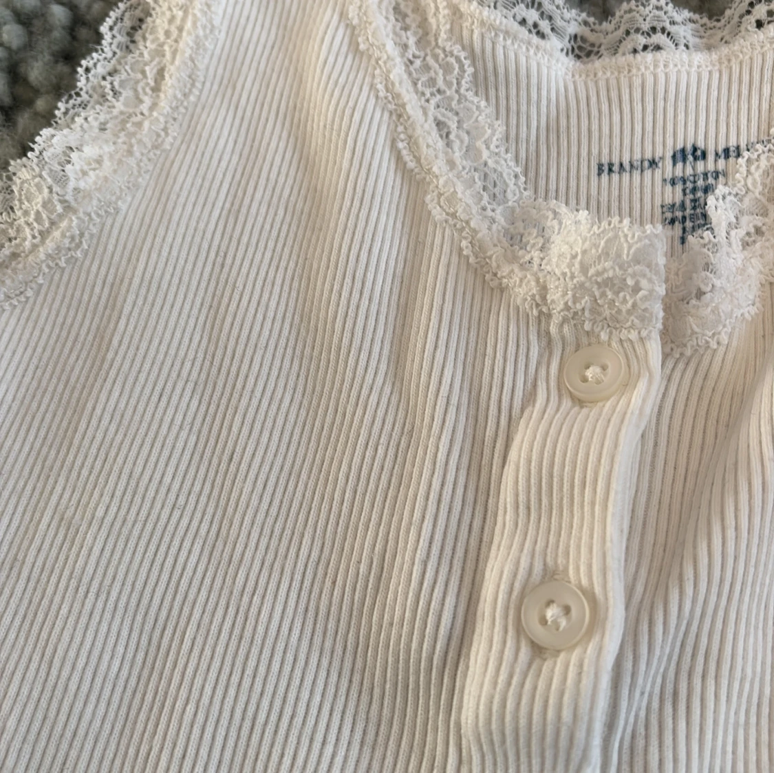 Supersöt vit ribbad linnetopp från Brandy Melville med spetskant runt halsringningen och knäppning framtill. Toppens material är mjuk bomull och den är ärmlös med en feminin och fräsch look. Perfekt att styla med jeans eller kjol för en chill vibe.