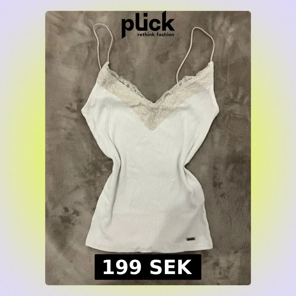 Supersöt vit ribbad linnetopp från Hollister med tunna justerbara axelband och spetsdetaljer vid v-ringad hals. Materialet är mjukt och stretchigt, perfekt för varma dagar. Metallbricka med Hollister-logga nedtill ger en extra touch. Bra för en y2k layered look och att ha under en henley eller babydoll top tillexempel.
