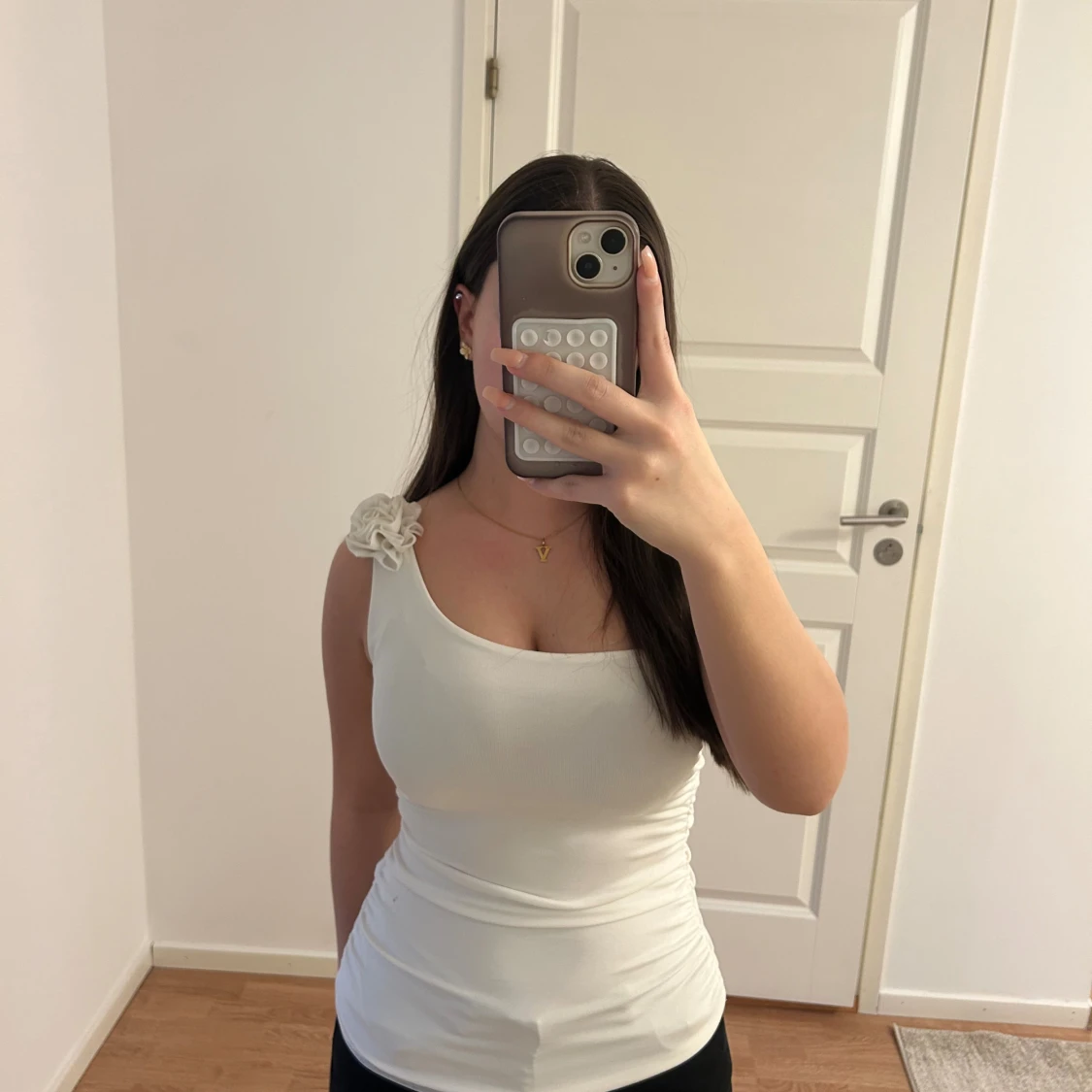 Säljer en vit ribbad linnetopp med en söt blomdetalj på ena axeln. Toppen är ärmlös och har en tight passform som framhäver figuren. Perfekt för dig som gillar stilrena och feminina plagg med en twist. På framsidan har den en liten svart fläck och en brun fläck på baksidan som följde me vid köpet. Toppen är från New Yorker i Tyskland.