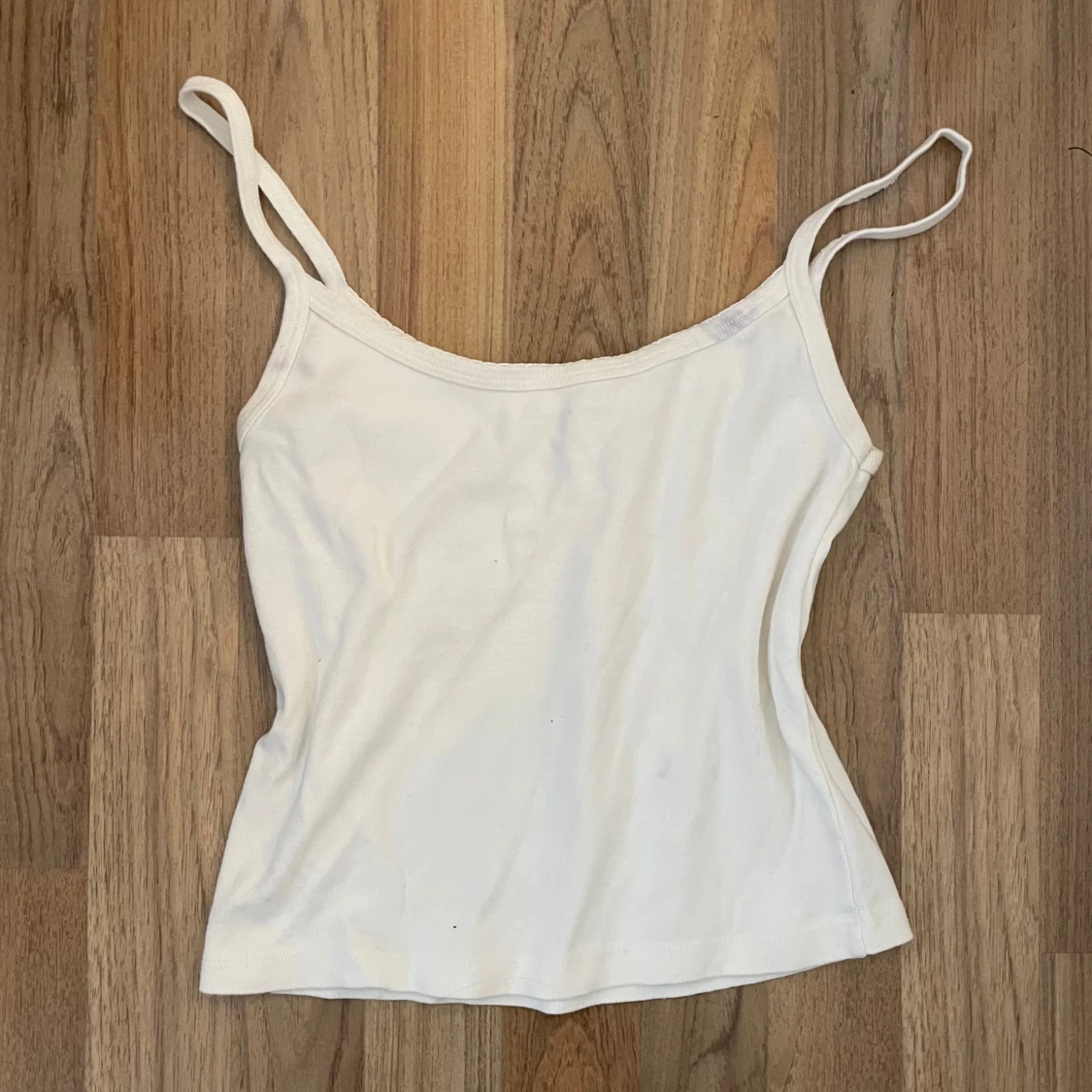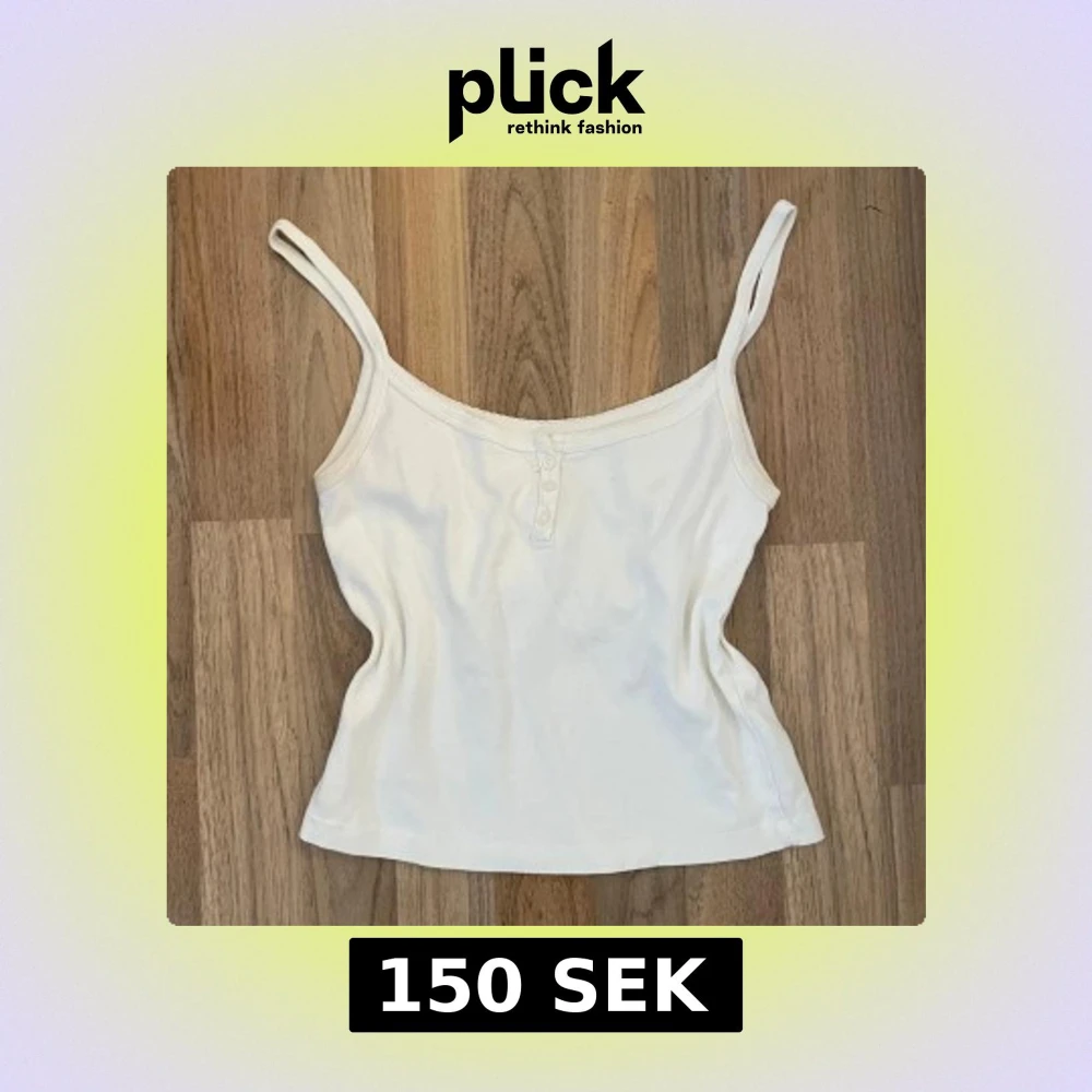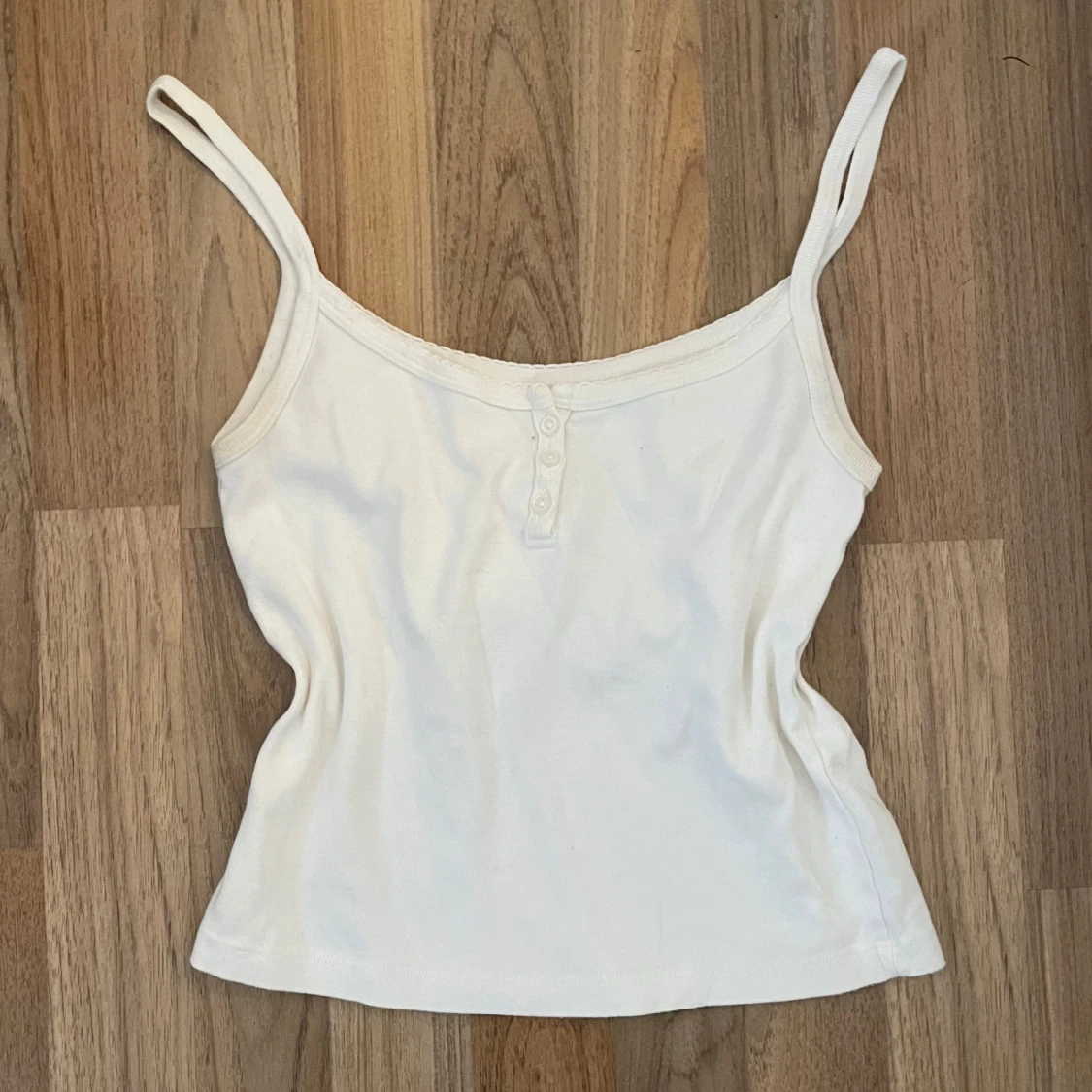 Säljer en vit linnetopp med smala axelband och ribbad känsla. Toppen har en enkel design med tre små knappar framtill och är tillverkad i mjuk bomull. Perfekt för varma dagar eller som lager under andra plagg.