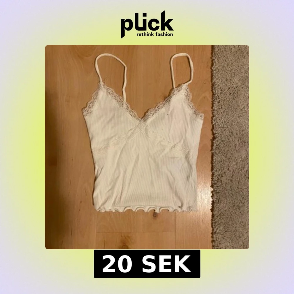 Söt vit linnetopp med tunna axelband och v-ringning. Toppen är ribbad och har fina spetsdetaljer längs urringningen och upptill. Nederkanten är vågig för en extra touch. Perfekt för sommarens alla outfits!