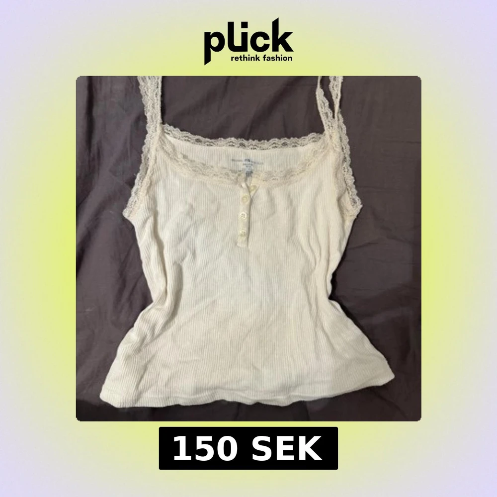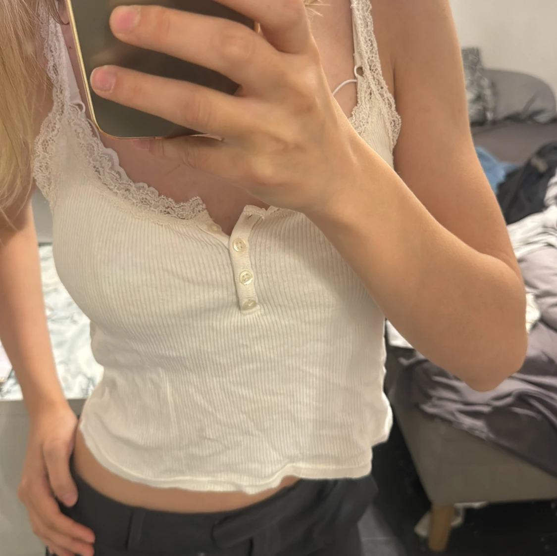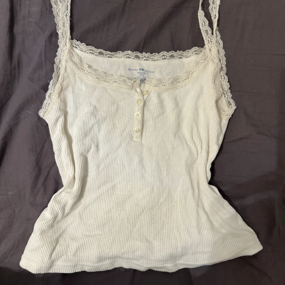 Supersöt vit ribbad linnetopp från Brandy med spetskant runt halsringningen och smala axelband. Toppen har dekorativa knappar framtill och en croppad passform som ger en fräsch och feminin look.
