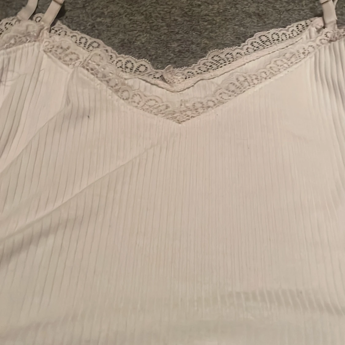 Säljer en söt vit ribbad linnetopp från Censored. Toppen har spetsdetaljer vid halsringningen och en liten rosett med ett hjärta framtill. Perfekt för en somrig look!