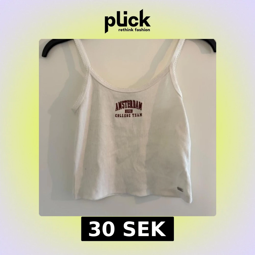 Säljer en vit ribbad linnetopp med texten 'AMSTERDAM COLLEGE TEAM' i rött framtill. Tunt material och smala axelband.