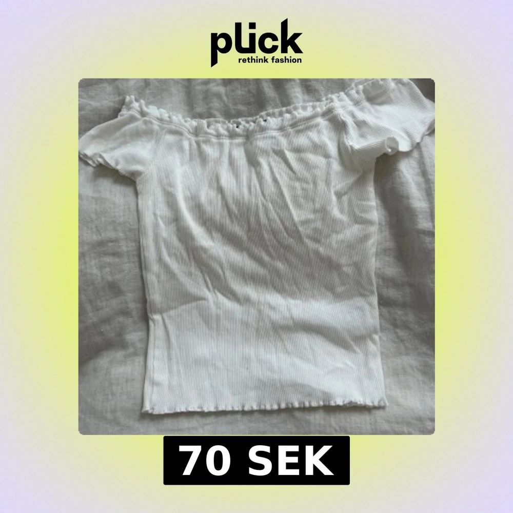 Supersöt vit ribbad topp med offshoulder-modell och korta ärmar. Den har en lätt rynkad kant upptill och nertill för en extra gullig touch. Perfekt för varma dagar och enkel att styla med jeans eller kjol.