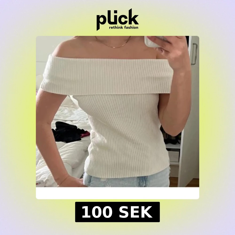 Säljer en snygg vit ribbad topp med offshoulder-design. Toppen är figurnära och har en bred kant upptill som ger en cool och modern look. Perfekt att matcha med jeans eller kjol för en trendig outfit.