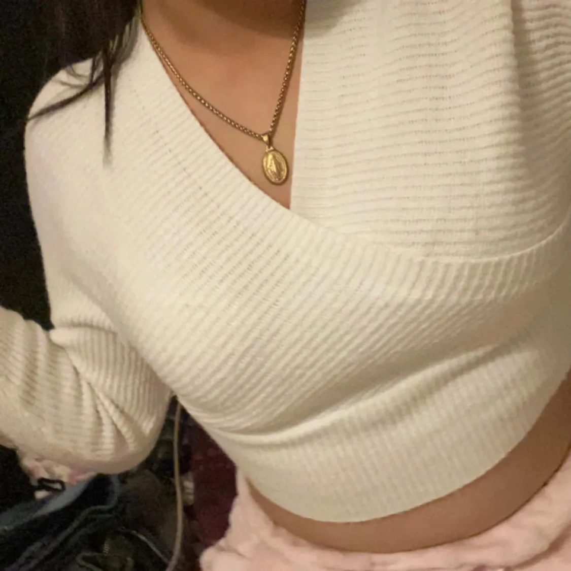 Säljer en stilren vit ribbad omlottopp med lång ärm. Toppen är croppad och har en v-ringad design som ger en modern look. . Använt några gånger . Är väldigt varm och skön