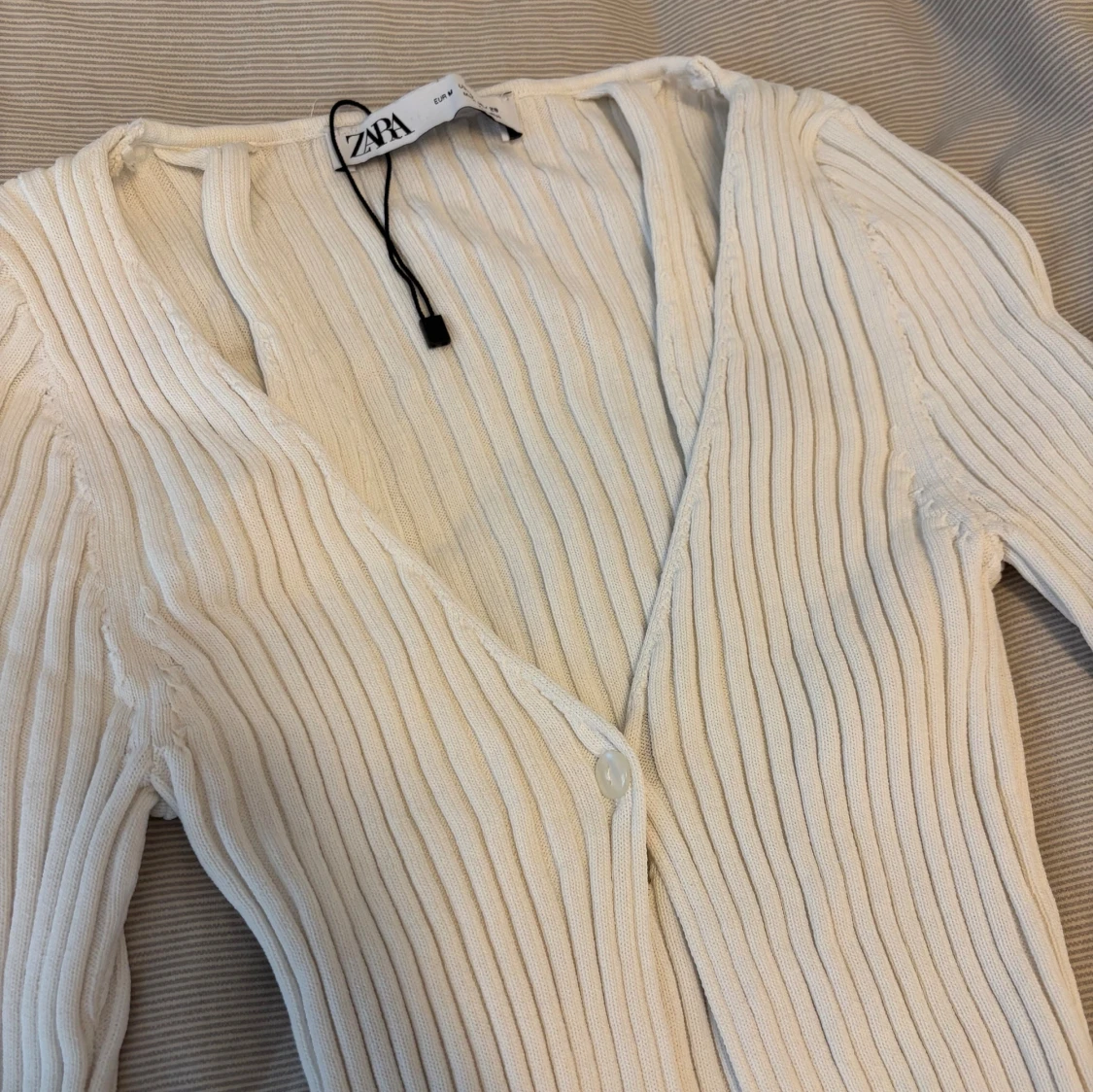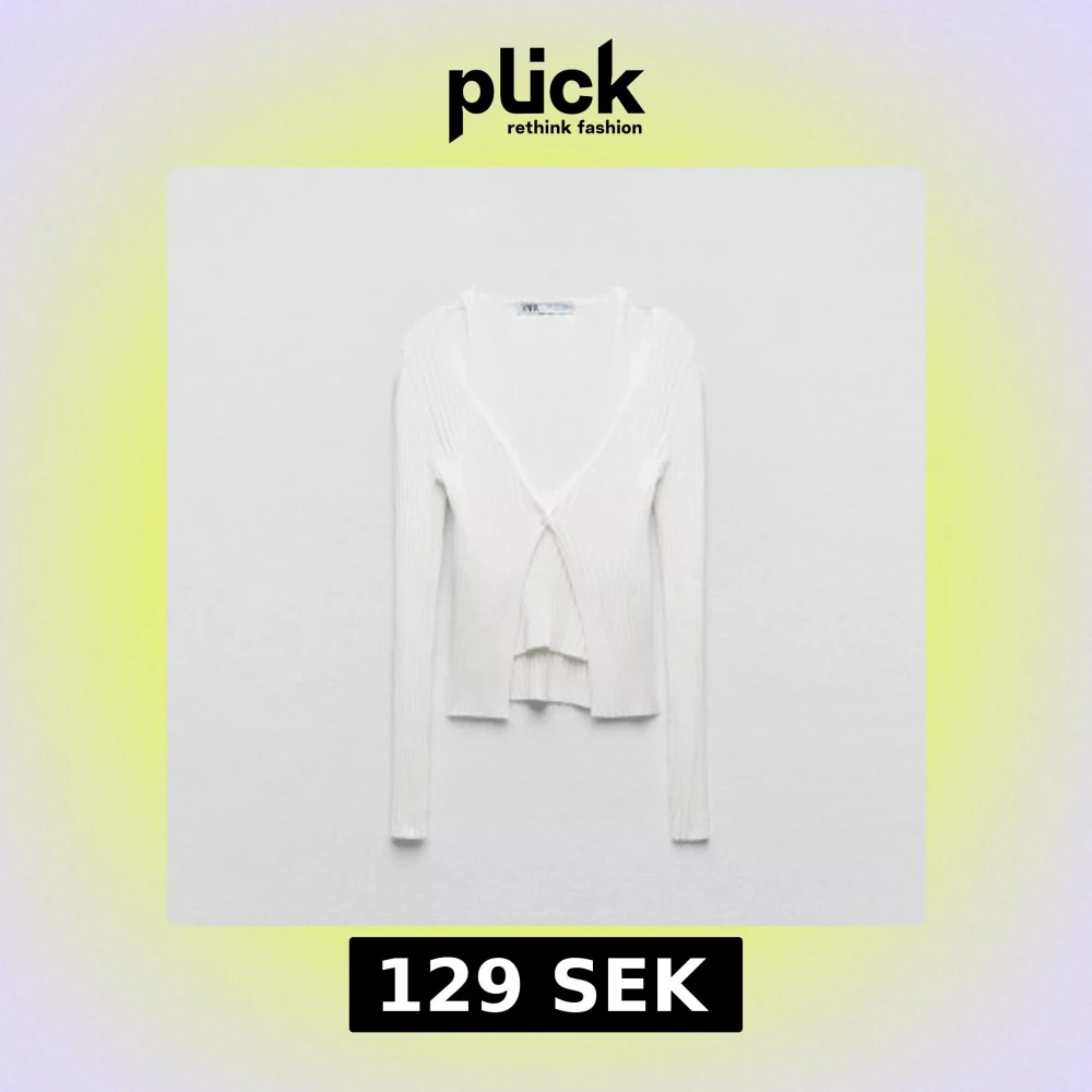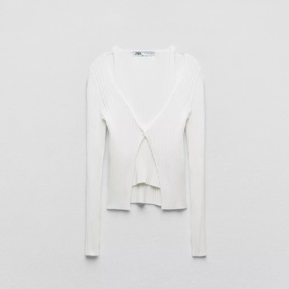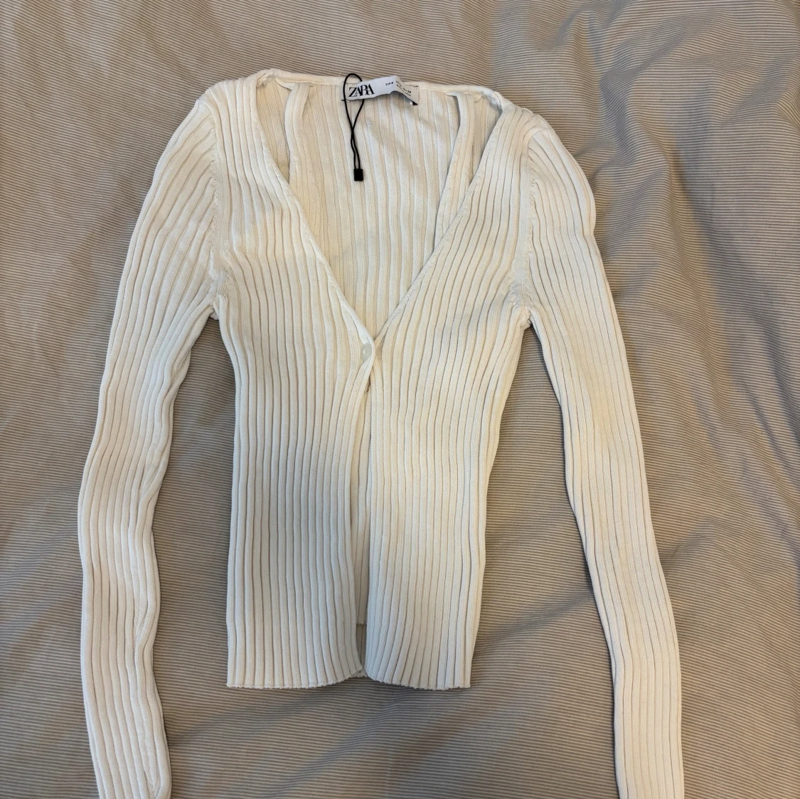 Supersnygg vit omlottopp från Zara med ribbad struktur och v-ringning. Långärmad modell med en knapp framtill som ger en stilren och trendig look. Perfekt att styla med jeans eller kjol för en fräsch vibe.